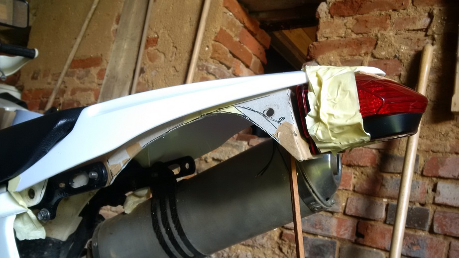 Ohhh el_lobo, ich sehe du hast das Yamaha DTR Heck aus meinem Beitrag verbaut. Leider geht mein Umbau sehr schleppend voran, da ich noch viele andere Sachen um die Ohren habe. Anfangs hatte ich auch überlegt den oberen Heckrahmen weiter zu verwenden. Jedoch passt dieser nur sehr straff über das Yamaha Heck. Deshalb lasse ich ihn weg und baue mir evtl. andere Halter. Den Teil des originalen Kotflügels vor dem Luftfilterkasten habe ich auch gelassen. Den Übergang zum neuen Kotflügel bekommt man ganz gut hin. Anbei der aktuelle Stand von meinem Umbau. Das Pappteil ist die Schablone meines neuen Heckrahmens aus Blech, der gerade zum Plasmaschneiden ist