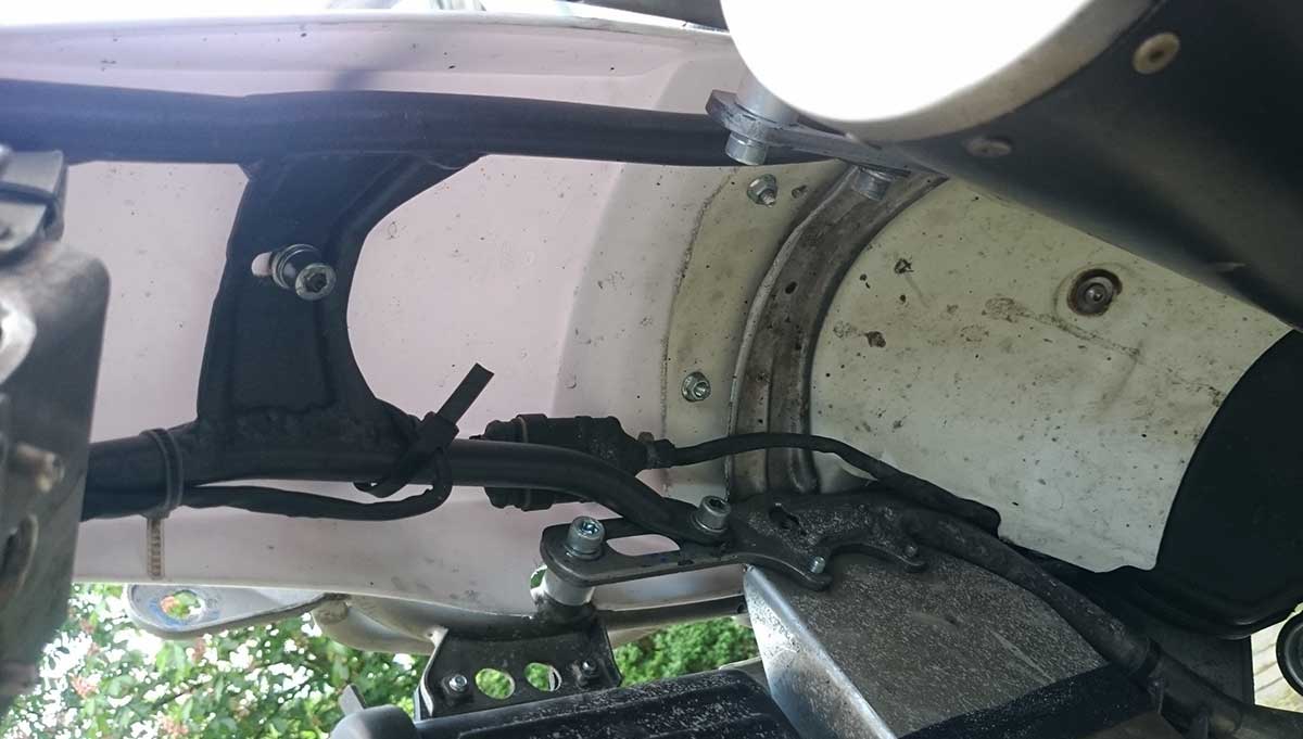 werden die Streben geschraubt die die Taschen vom Auspuff fernhalten.