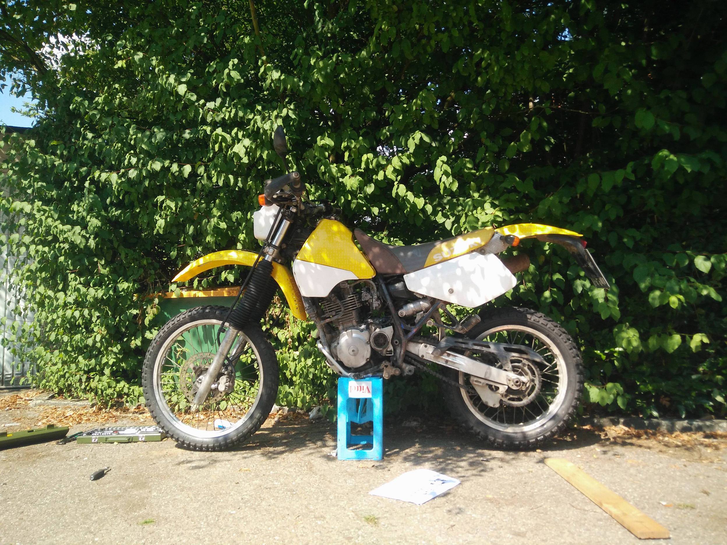 So Freunde, nach 6 Werkstätten die entweder nicht das Werkzeug oder Know How oder Zeit hatten, hat Motorrad Christiansen die Schraube mit zwei Kopfdrücken auf den Druckluftschlagschrauber gelöst. Der restliche Gabelservice lief ziemlich problemlos, nur fürs reindrehen musste ich wieder zum Freundlichen fahren. Nach mehreren Wochen nackt auf dem professionellen Polymermontageständer kann die DR endlich wieder stehen. :thumbup: