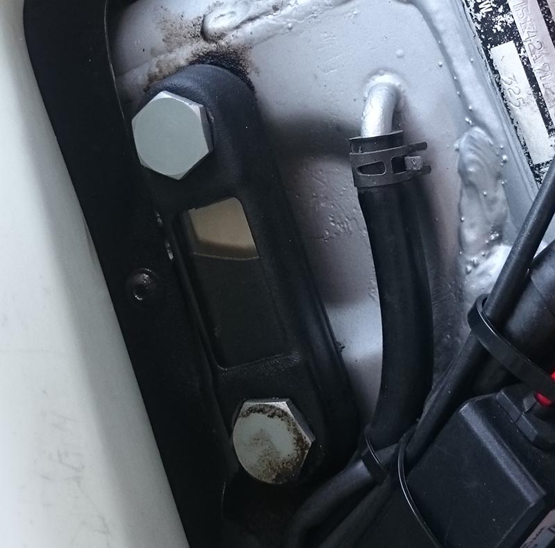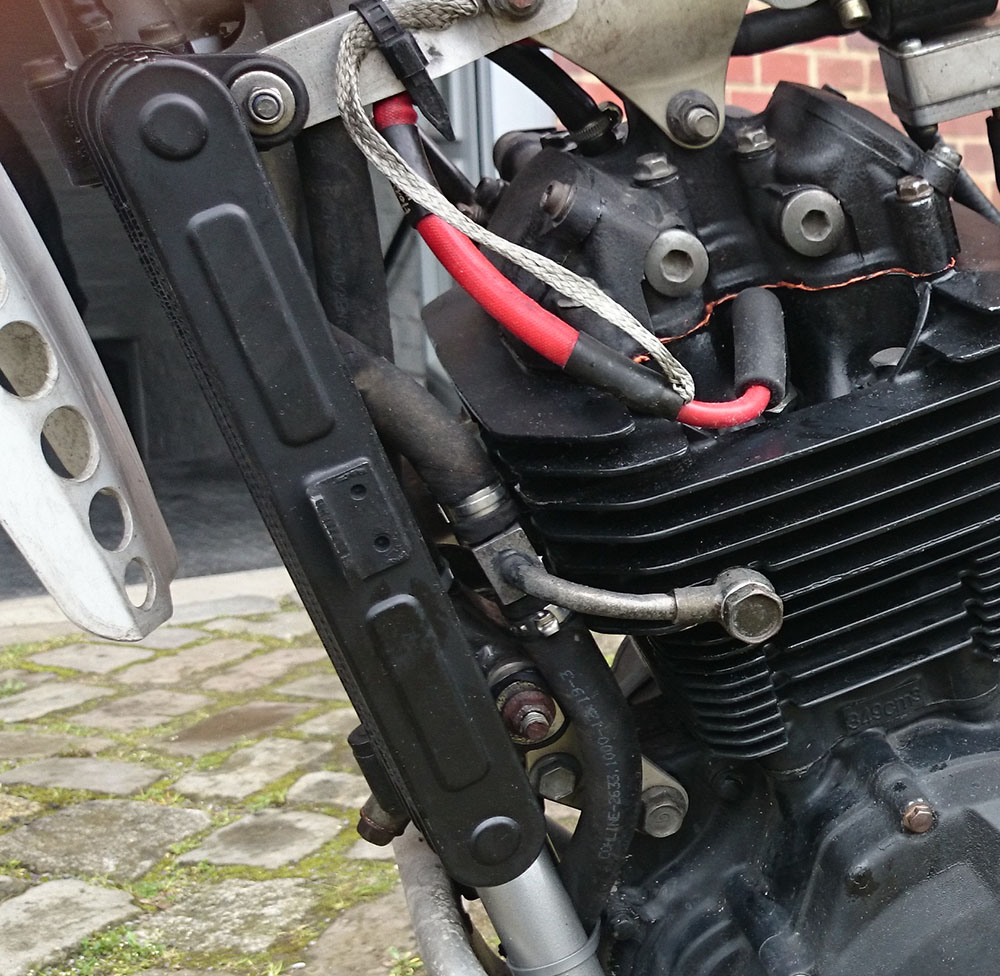 und unten mit einem sehr langem M8 Bolzen mit an der vorderen Motorbefestigung verschraubt. Dabei hängt der Kühler