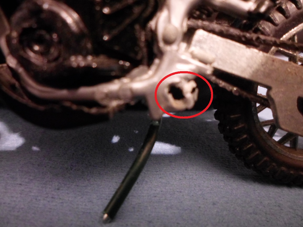 Meine Hoffnung geht nun dahin, das dass ausgehärtete Epoxy eine 1,5 mm Bohrung verkraftet. Diese Bohrung trägt dann die Schraube, diese wiederrum wird den neu angefertigten Seitenständer tragen.