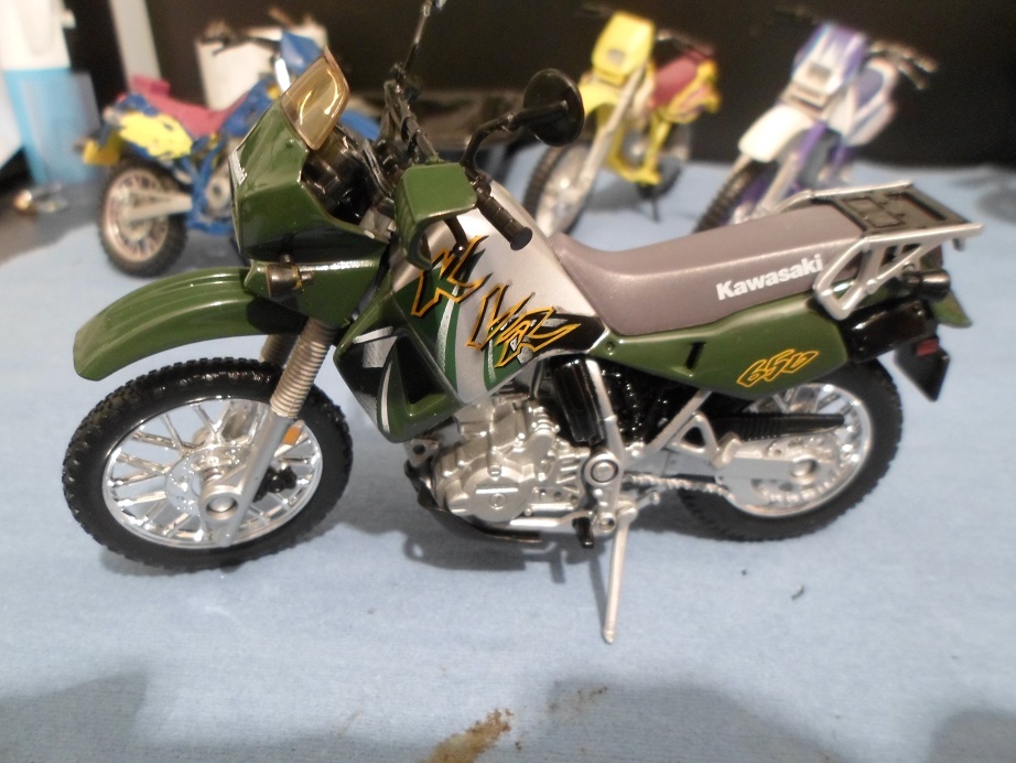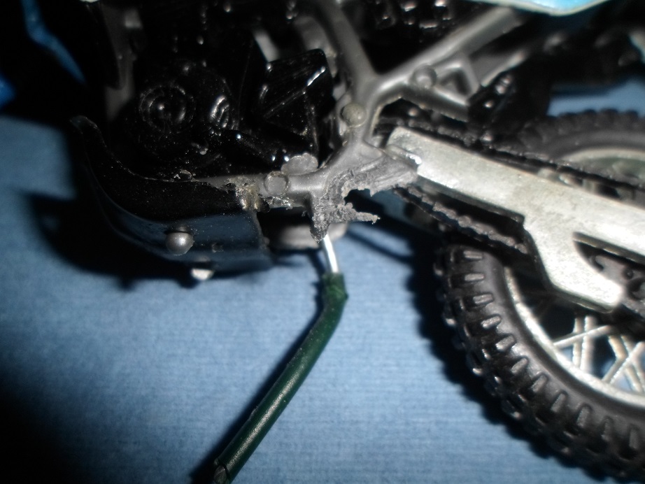 Streng nach dem Motto: "Was richtig groß viel Spass macht, kann auch ganz klein viel Freude machen"...habe ich kürzlich in einer großen Kleinanzeigen-Plattform ein Modell einer Kawasaki KLR 650 ergattern können. Leider war bei dem Modell der Original-Seitenständer abgebrochen, die "Halterung" am Rahmen für selbigen ausgerissen...der "Vorbesitzer" hatte einen wohl halbwegs funktionalen, aber optisch und technisch nicht korrekten " Ersatzständer" dran gebastelt.