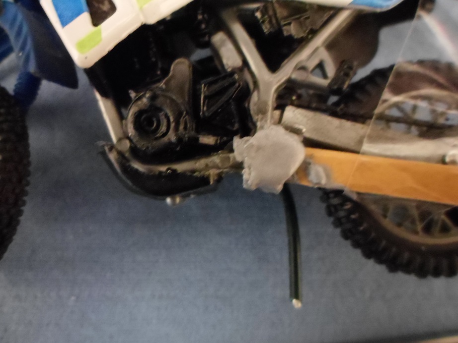 Zunächst wurde die Stelle am Rahmen mit einer Mini-Drahtbürste in einem Rotationsmotorgerät eingespannt gereinigt - damit das Epoxy auch guten Grip findet. Das kein harz der welt frei in der Luft hält, wurde die Reparaturstelle unterlegt. Hier habe ich ein kleines Stück " Wachspapier ( die Unterseite von doppelseitigen Klebeband ) auf ein Holzstück geklebt, dieses ausgerichtet und mit Klarsichtklebeband "fixiert"