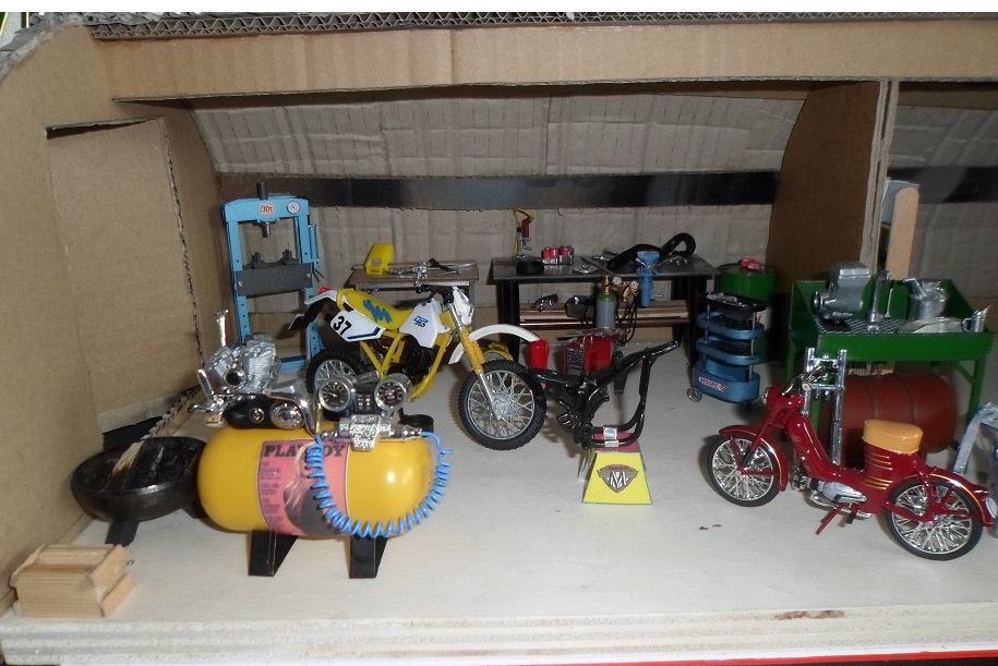 Man kann vieles an Einrichtung im Handel kaufen - manches baute ich lieber selbst. Dazu gehört der Ofen, der Kompressor , der Schweisstisch - das Räderregal. die beiden Regale, die kleinen Aktenordner ( da sind die Werkstatt-Handbücher als Kopien drinne ;) ) Die Feuerschale, den Motorradbock "Maico" usw.