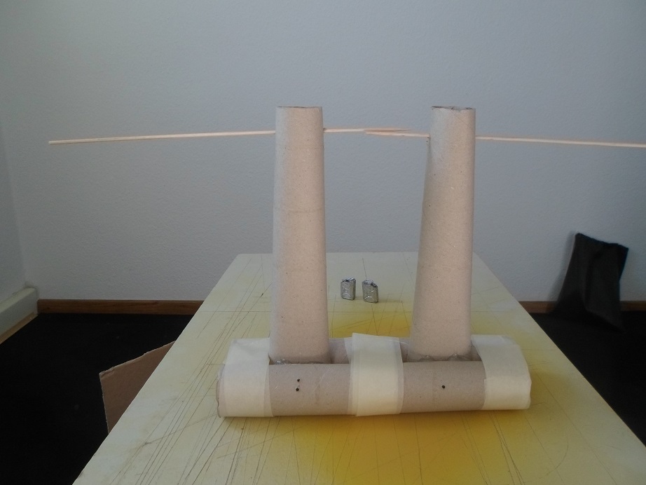 Etwas Billig-Klebeband - vier Papprollen von Küchenrolle -etwas Heißkleber und zwei Schaschlikspiese - fertig ist der Lackierständer!