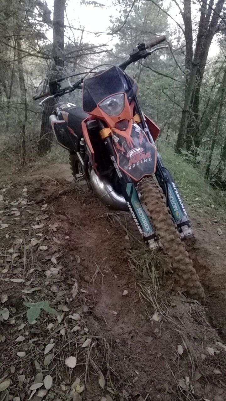 Hatte mir vor einigen Jahren mal diese EXC300-E gekauft. Wollte mal sehen wie sich die großen 2T- Enduros fahren, die tun das sehr gut.