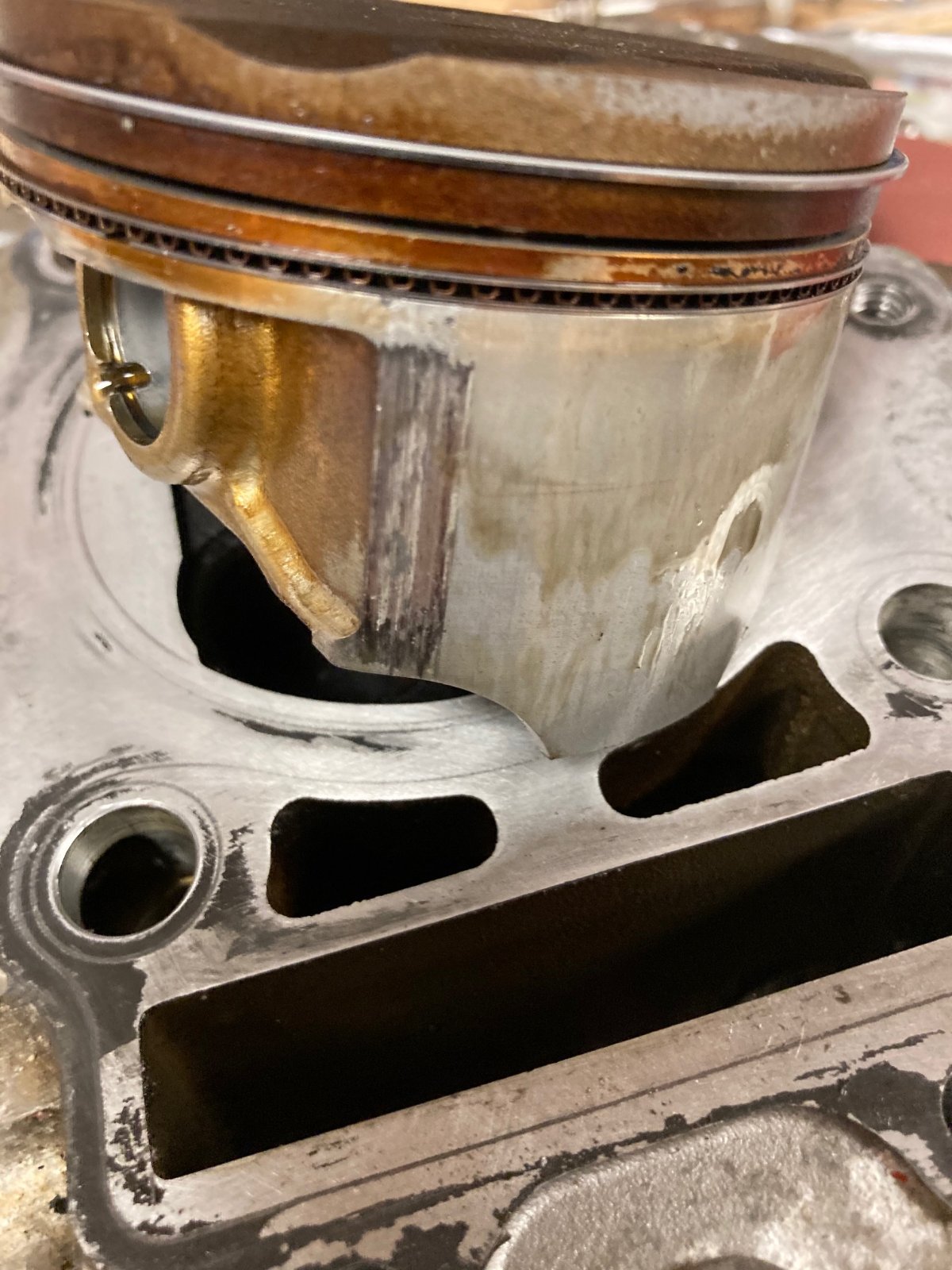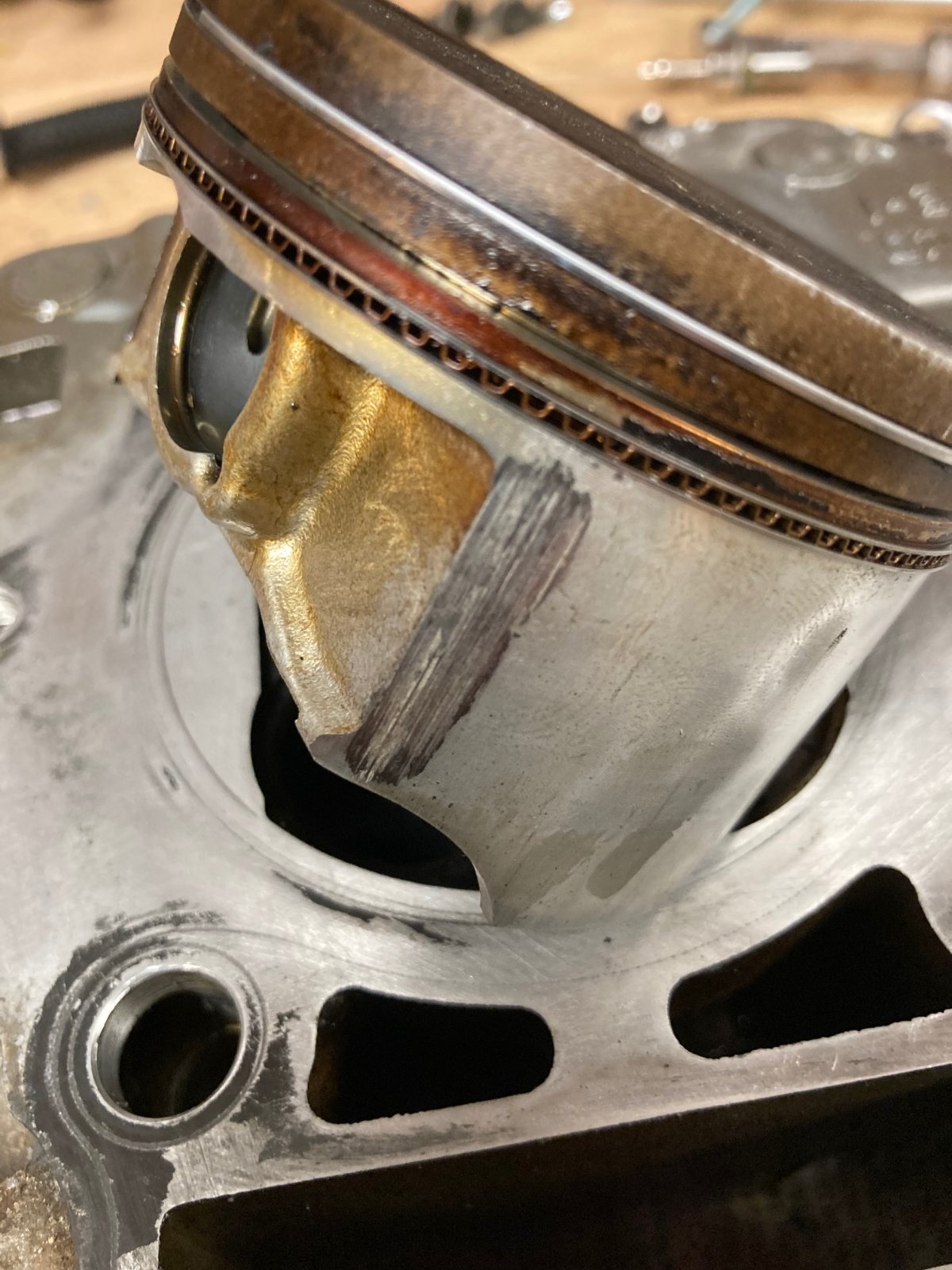 Der Kolben hat an allen 4 "Ecken" Schleifspuren, welche sich auch am Zylinder zeigen.