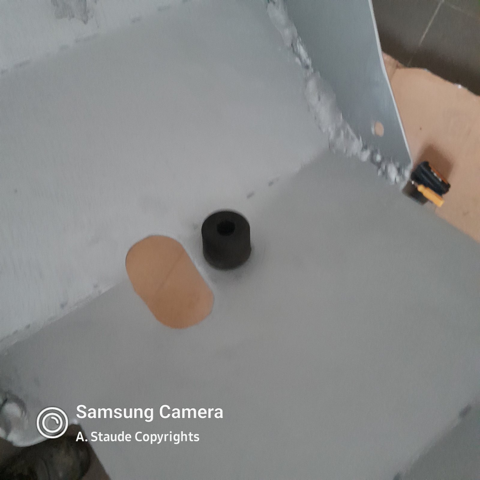 Der ausgesuchte Gummipuffer paßt bestens. Bei der Montage des Schutzes wurden nun 2 M8er (8.8) und Distanzhülsen für die seitliche Befestigung neben den originalen M8er für die Front genutzt. Den 13er Schlüssel hab ich in der Werkzeugrolle bereits ergänzt.