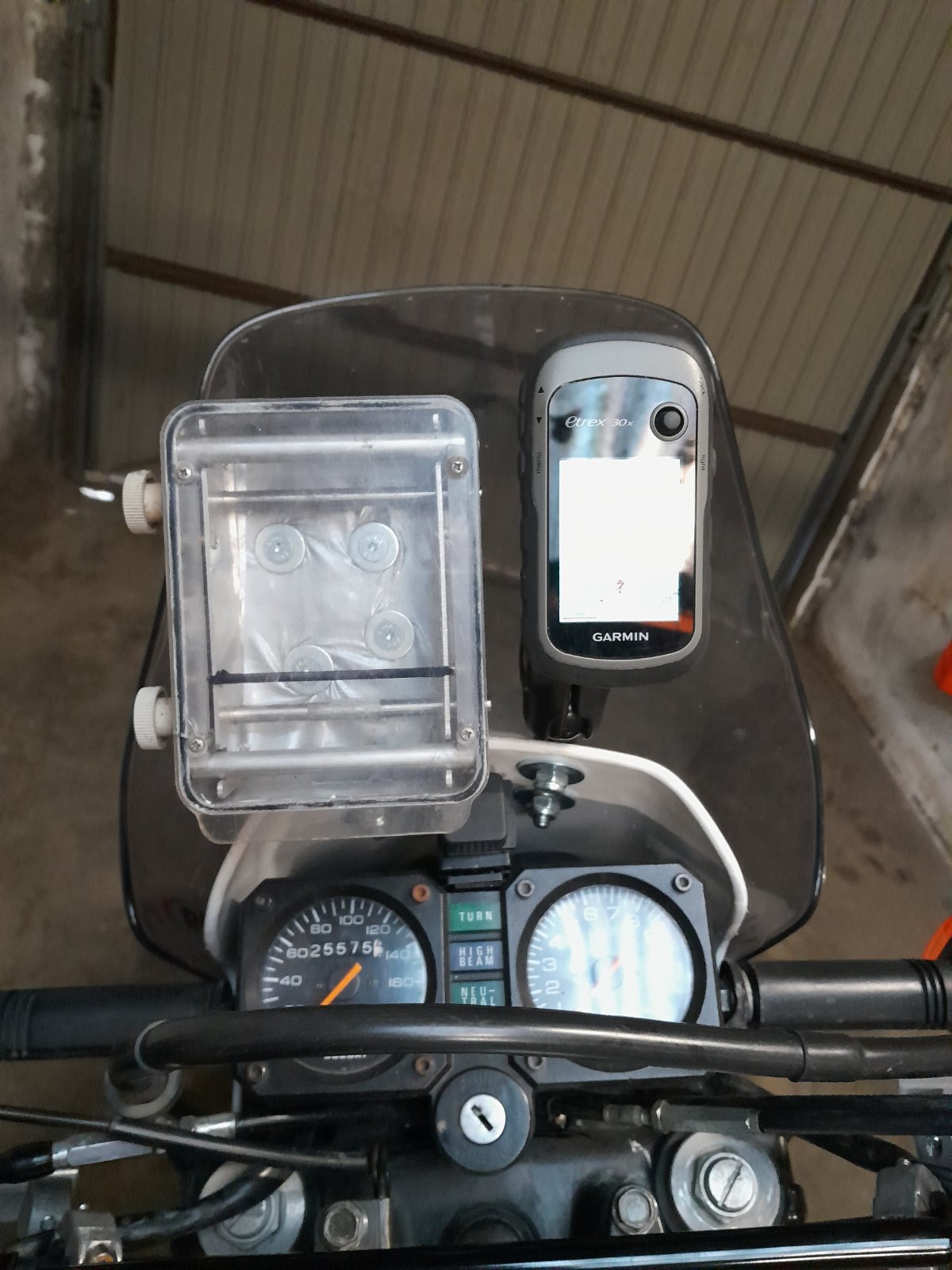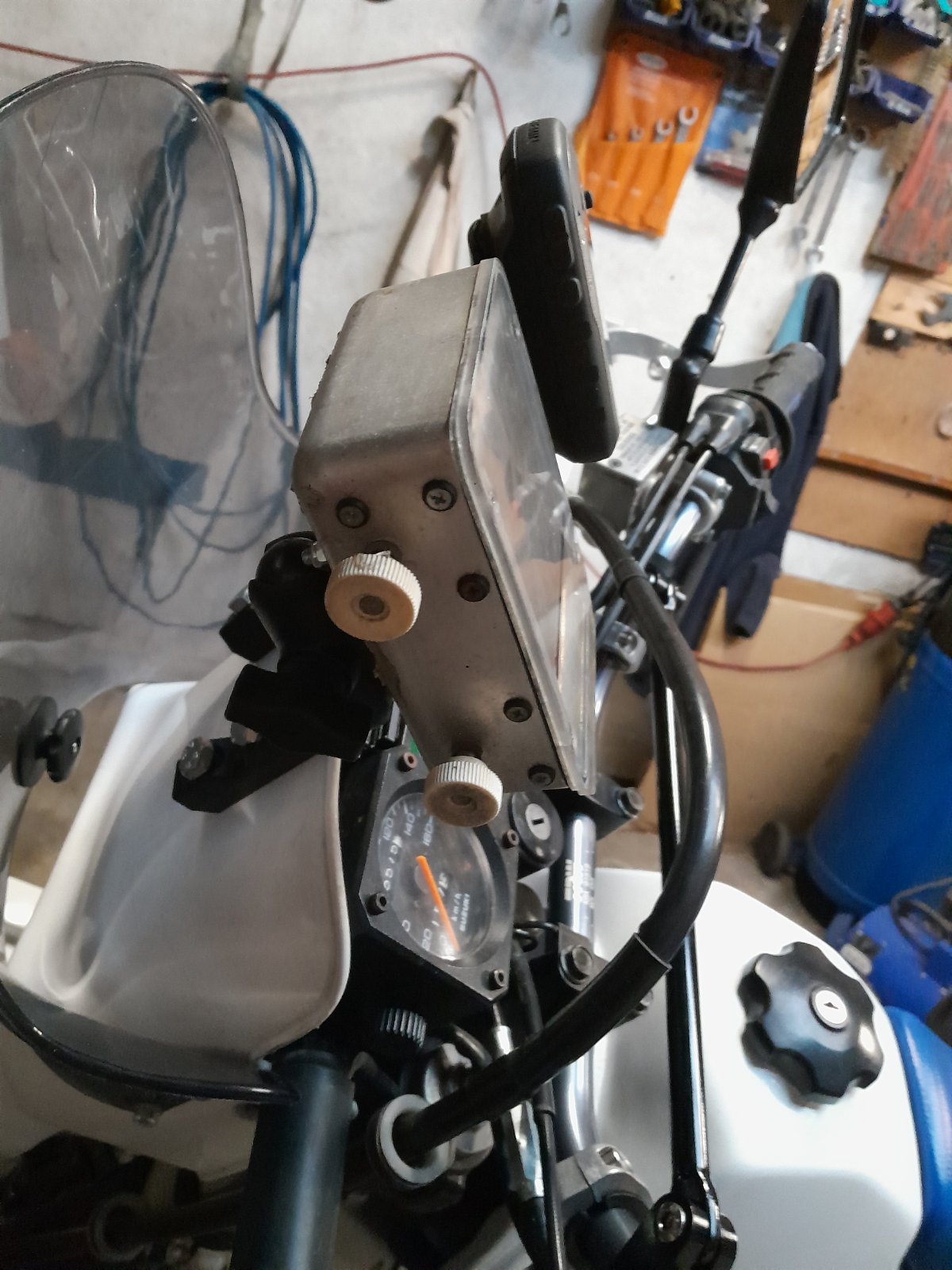 Ich hatte noch einige RB-Halter hier; der kleinen RB-Compakt sollte es dann werden. Ein Ram-Mount angebracht und dann fest gestellt das "nur" eine Navimöglichkeit für längere Touren in fremden Gefilden etwas spannend war (ich spreche aus Erfahrung von früher...). Also 2 entsprechende Befestigungen am "Nummernschild" angebracht, den vorhandenen einfachen Kugeldingens entfernt und... Fertig.