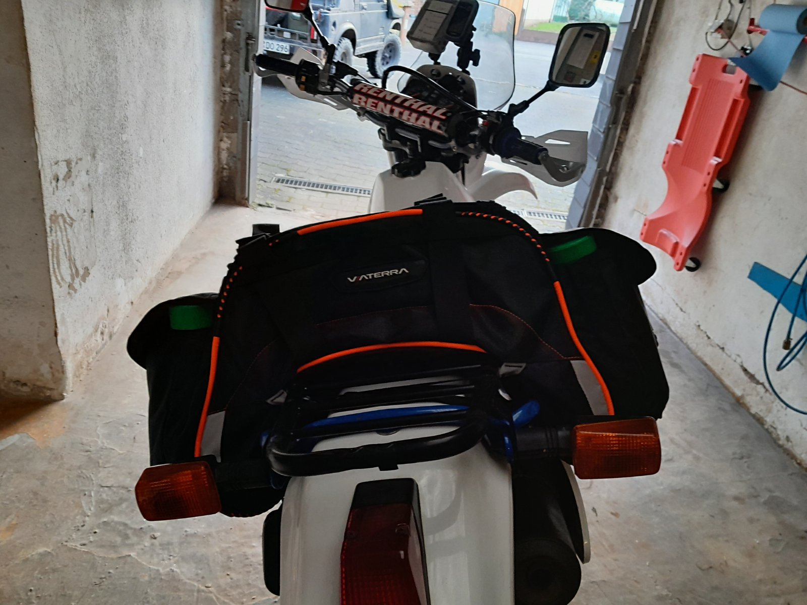 Gesamt sind an Gepäck dann 19,5kg (inklusive 6 liter Sprit) hinten drauf - damit läßt sich die Fuhre noch sehr gut auch im Gelände bewegen.