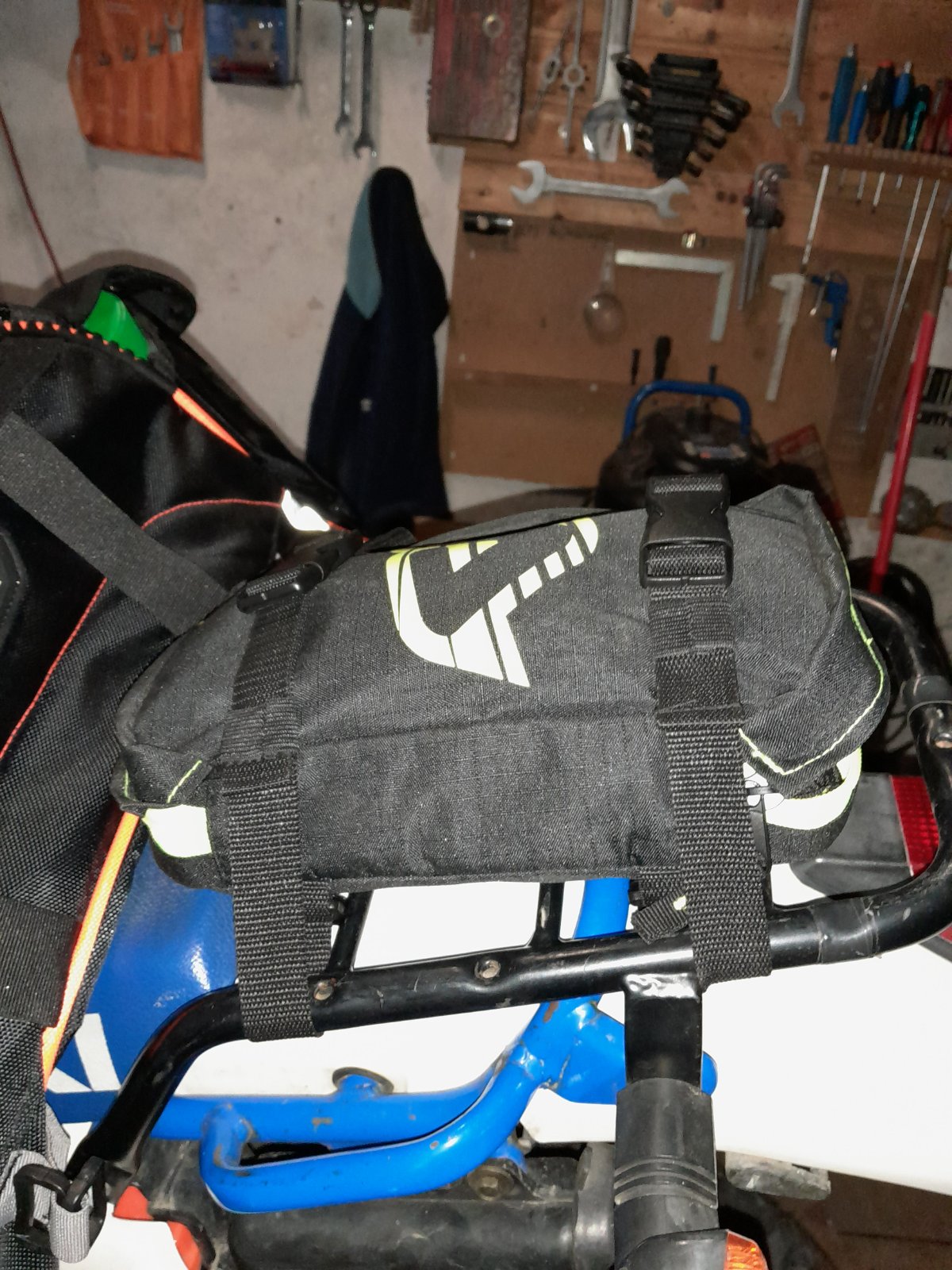 Dann folgende idee; das ganze weiter nach hinten (bei unter 20kg mach ich mir da keine Gedanken) auf die Fendertasche. Da kommt ja noch der Schlauch (21") rein; somit wird das ganze noch höher...
