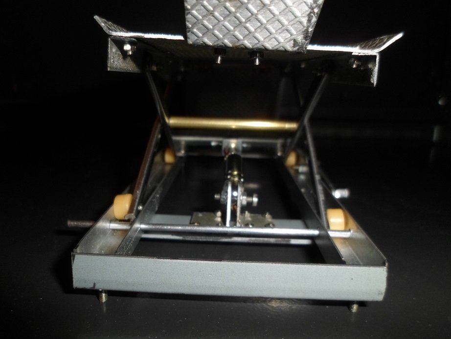 Alles an verbauten Material stammt aus Elektroschrott-Geräten. der "Hydraulik-Zylinder" ist der unterste Teil einer Radioantenne, Die beiden Fußpedale sind "Hebel" aus einem alten Doppel-Kassettenrecorder.