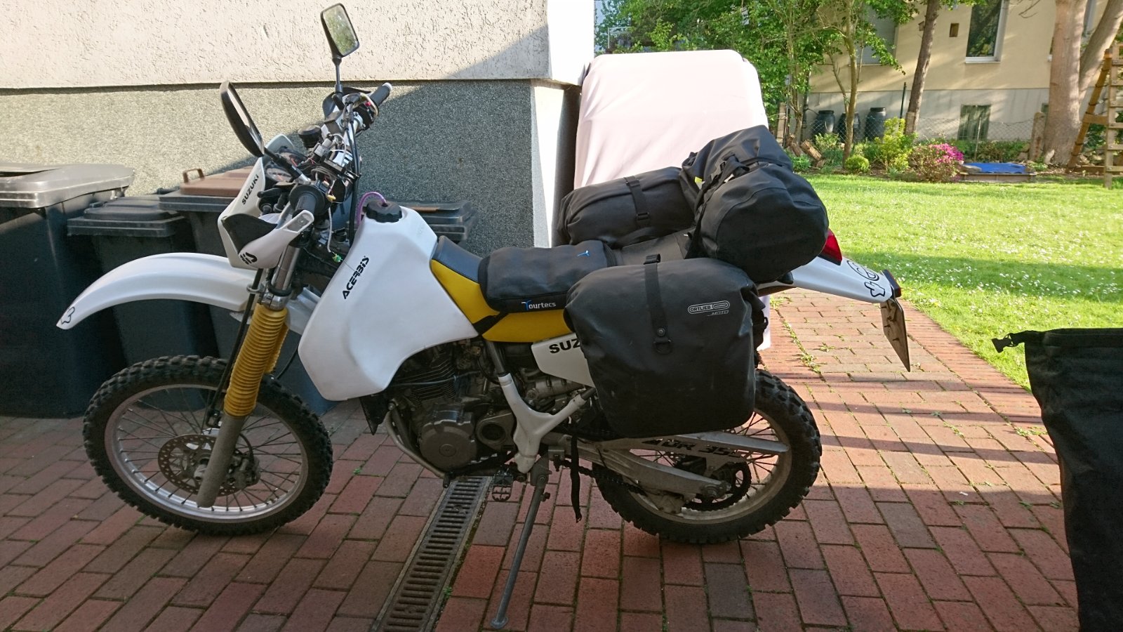 einen Tankrucksack kann ich zwar nicht empfehlen, aber als Packtaschen nutze ich ein paar alte von Ortlieb. Glaube heute laufen die bei touratech unter anderem Namen. Glaube heißen Endurance. Die eher waagerechte Form ist gut wenn man eine Kicker fährt. Bei einer se gehen auch die von enduristan. Sind aber etwas teuer.