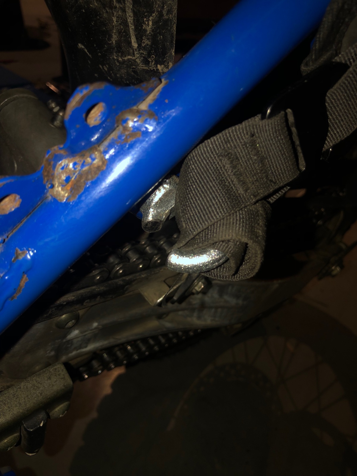 Anstelle der Soziusfußrasten habe ich Petzl Va Kletterhaken gesetzt. Soziusrasten gehen auch, waren bei mir aber nie dran. Kletterhaken soweit aufgefräst bis die Schnallenverschlüsse durchgepasst haben.
