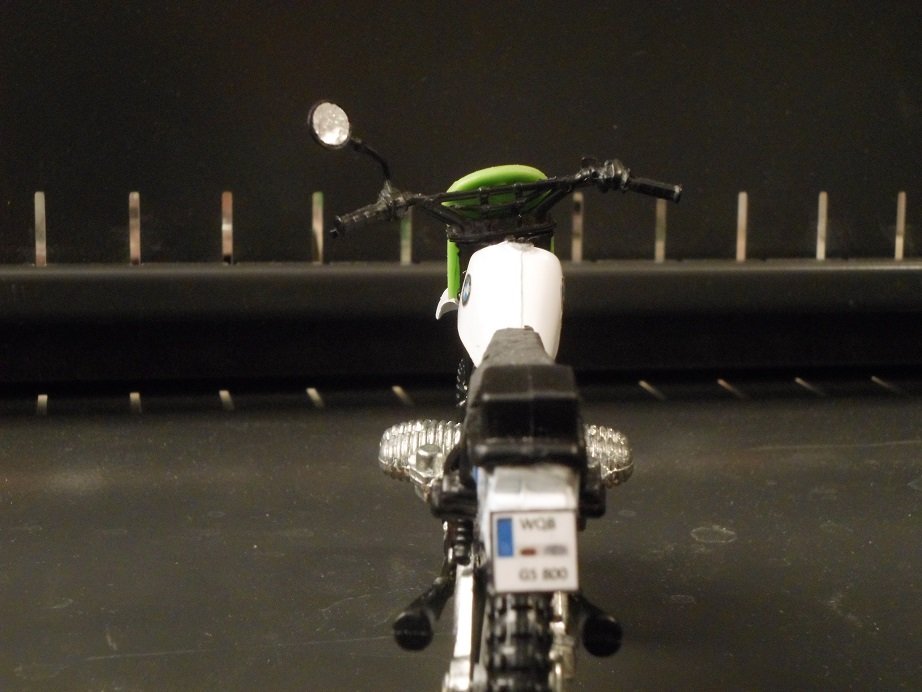 Zusammen gesetzt aus einem Maico-Modell und einem BMW R 80 G/S Paris Dakar-Modell im Maßstab 1:18 Lampenmaske von einer Kawsaki KDX 250 ( in Anlehnung an die alten GS-Masken Typ "Elba" von Acerbis.)