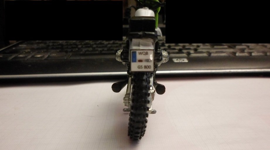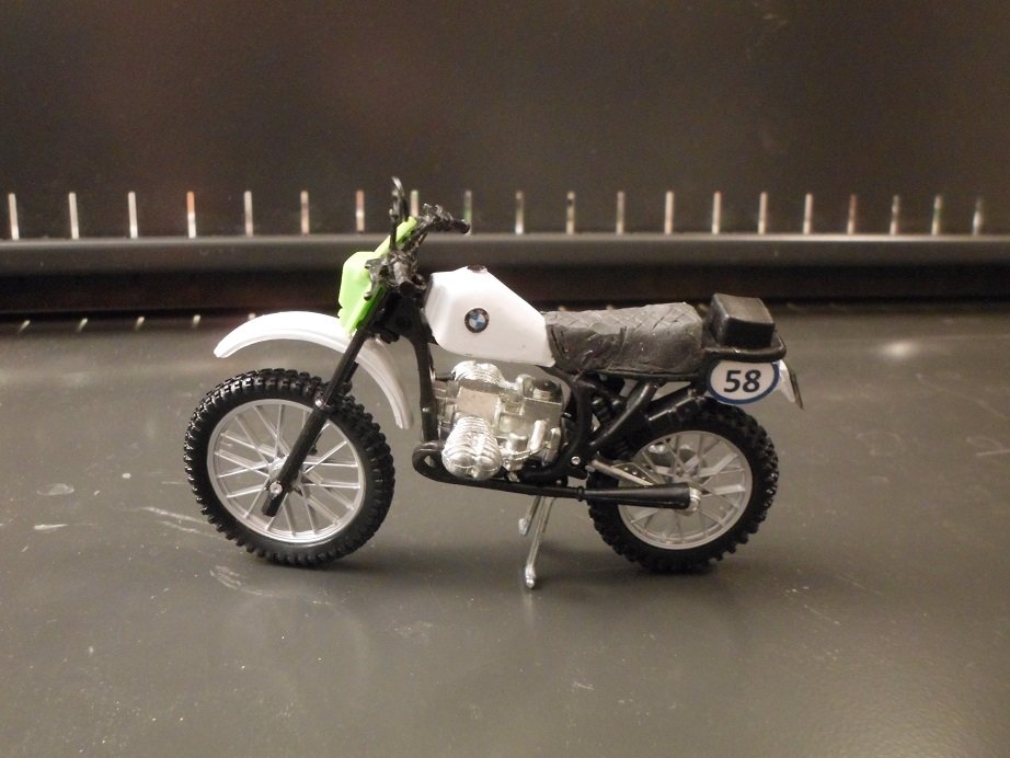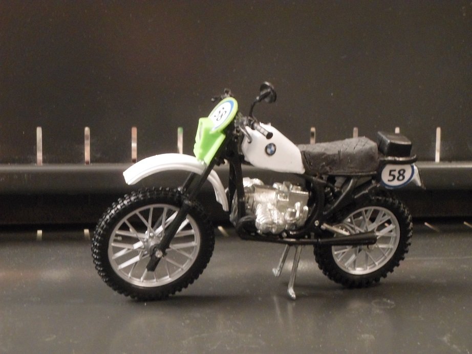 Zusammen gesetzt aus einem Maico-Modell und einem BMW R 80 G/S Paris Dakar-Modell im Maßstab 1:18 Lampenmaske von einer Kawsaki KDX 250 ( in Anlehnung an die alten GS-Masken Typ "Elba" von Acerbis.)