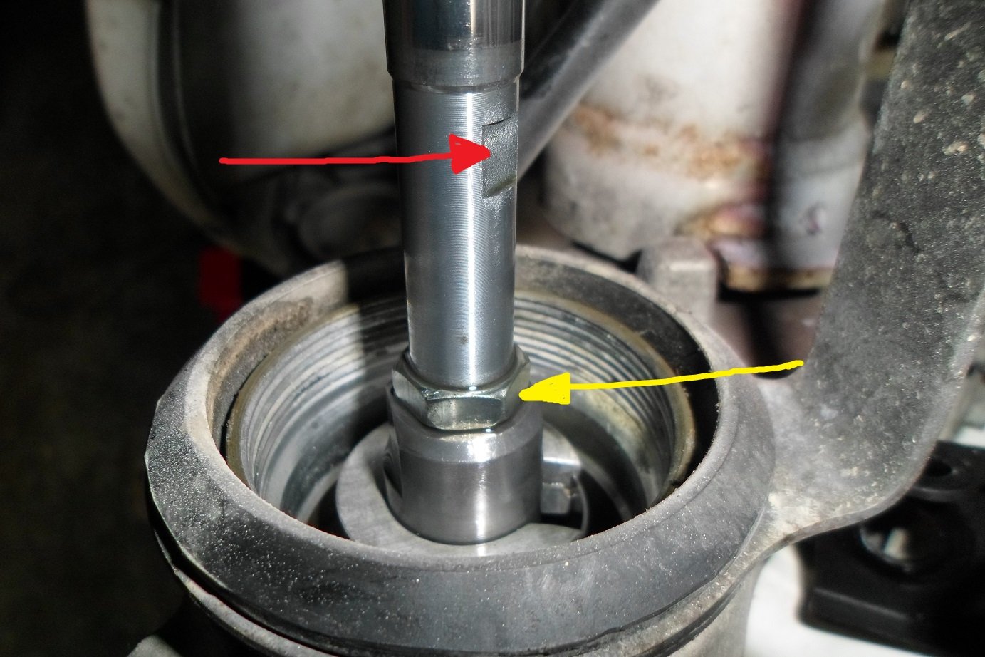 Zuvor wurde geschrieben, dass die Mutter an der Kolbenstangenunterseite ebenfalls eingeklebt ist. Diese wollte ich anfangs lösen. Jedoch hat das mit den Kontermuttern nicht richtig geklappt und das Gewinde wollte ich auch nicht zur Sau machen. Somit habe ich mir gedacht, das Puffer über die Mutter zu schieben. Hierzu nahm ich einfache eine kegelförmige Schraube aus dem Sanitärbereich. Diese steckte auf den Gewindestumpf und trieb das Puffer mit ausreichend Fett über die Mutter. Die Sache ging erstaunlich einfach von statten.