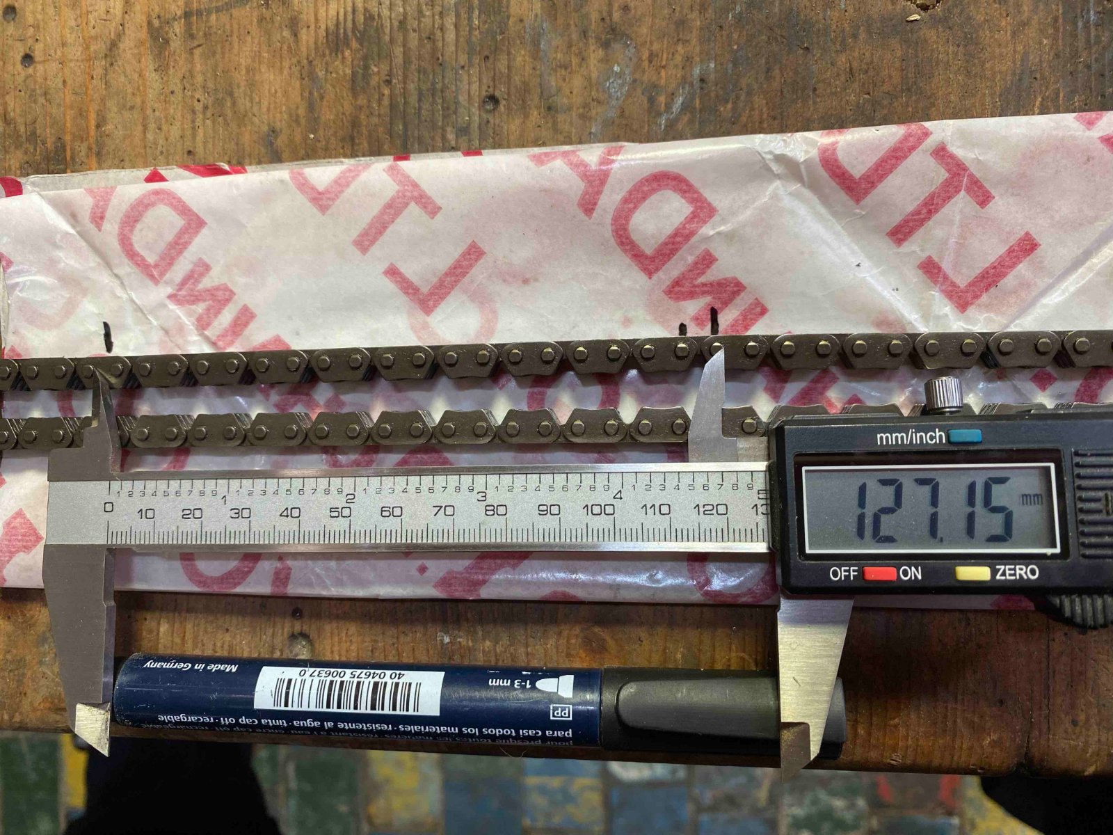 Auf dem Foto die alte Kette, noch um einiges von der Verschleißgrenze von 128,9 mm entfernt. Ich gehe mal davon aus, dass das so richtig gemessen wurde? Die Abbildung im WHB lässt sich so interpretieren, dass von Mitte zu Mitte (oder eben von Außenkante zu Außenkante) der Nieten gemessen werden soll?