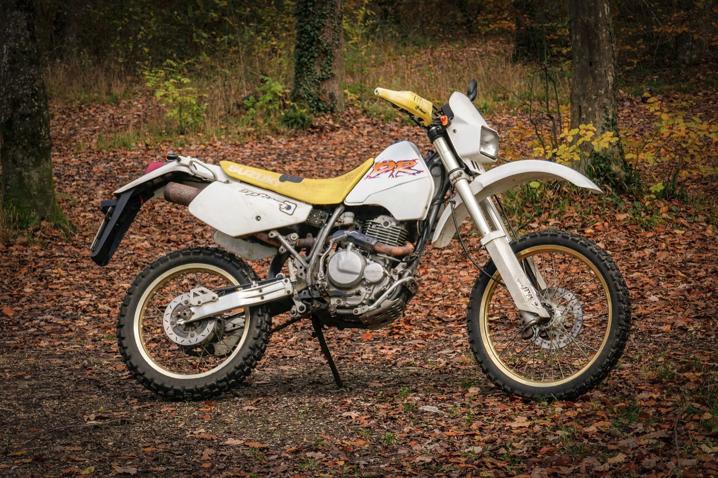 Ich bin Mitte 40, wohne in Konstanz am Bodensee und bin seit über 25 Jahren glücklicher Besitzer einer DR350 SHC. Das Ding hatte ich mir, damals noch in Nordhessen wohnhaft, mit meiner Ziwi-Kohle gebraucht gekauft. Damit gings dann erstmal auf stillgelegte Truppenübungsplätze, Kiesgruben und bisschen über die Feldwege der Umgebung. Zum Pendeln und Alltag wurde es natürlich auch genutzt. Leider wurde es über lange Phasen nicht genutzt und auch etwas vernachlässigt. Über die Jahre wurde aber auch immer wieder mal was daran modifiziert oder. Allem voran das Fahrwerk – dieses SHC-Geraffel war nämlich relativ bald im Eimer und wurde durch ein Wilbers Federbein und Alubuchsen in der USD-Gabel ersetzt.