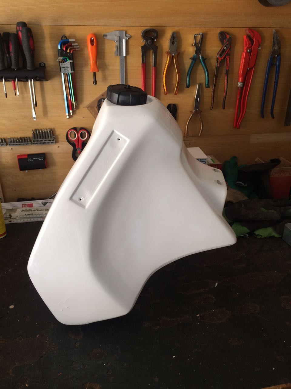 Der Tank ist frisch lackiert und sieht jetzt auch echt super aus. Gestern hätte er dann montiert werden sollen.