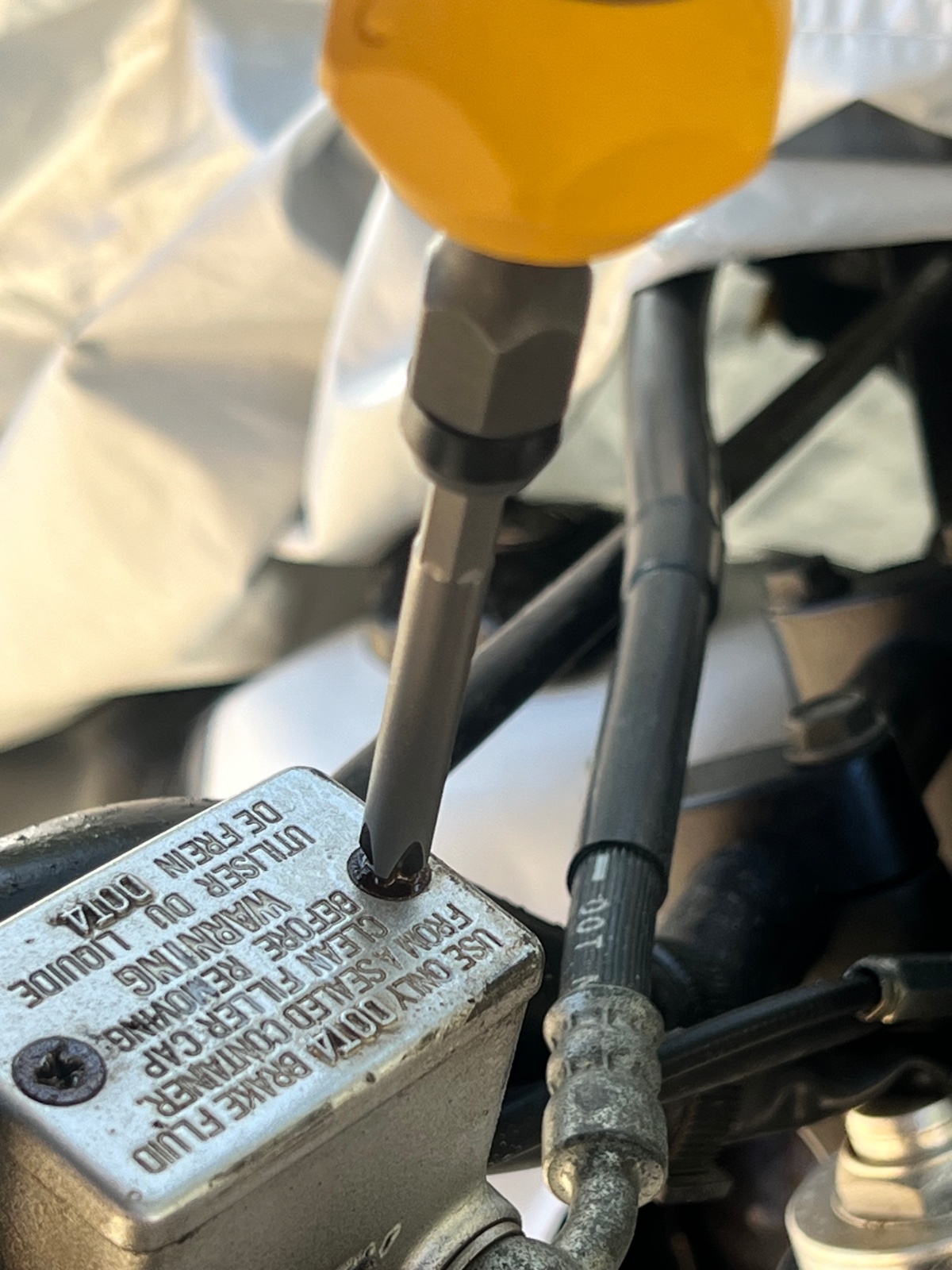 Hatte Probleme die Schrauben zu öffnen. Bremsflüssigkeit war seit vielen vielen Jahren nicht gewechselt worden und die Schrauben fest. Beim Versuch mit einen normalen Schraubendreher sind sie gleich ausgeniddelt.