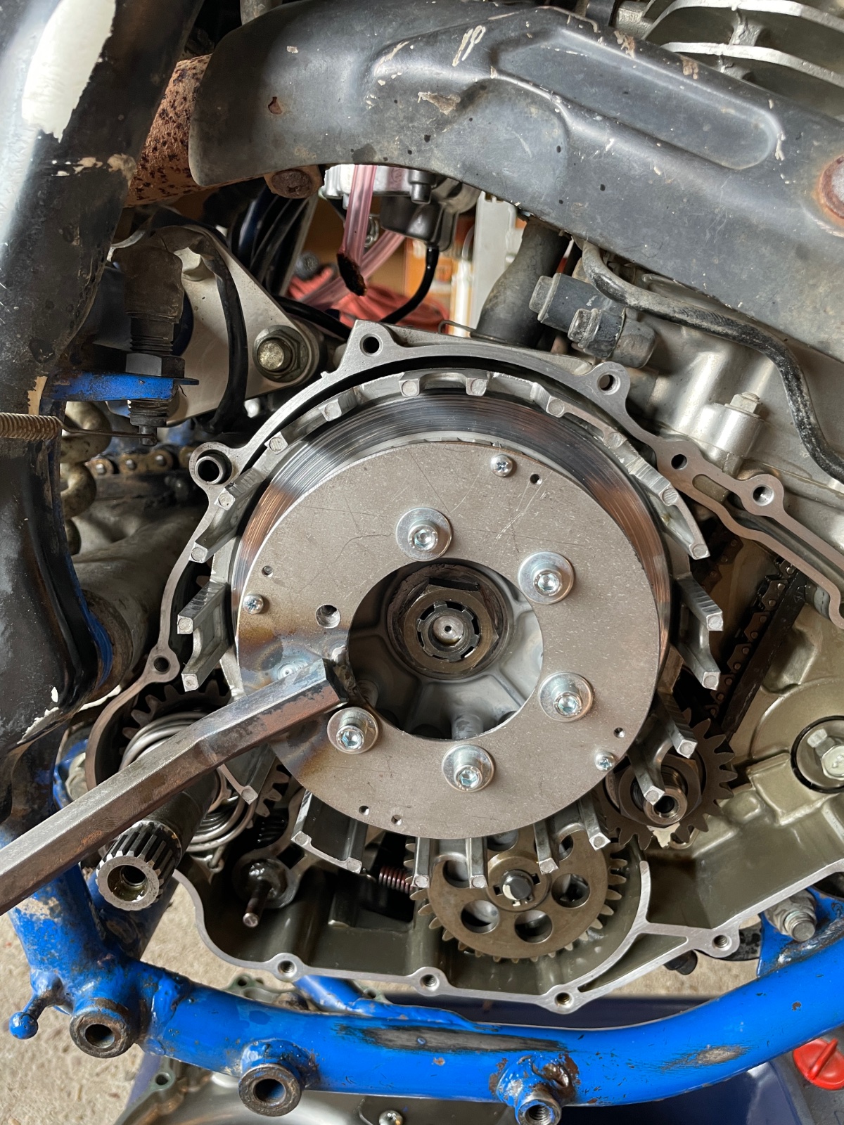 Ich bin nicht im Besitz des Gegenhalters für den Kupplungskorb, deshalb war der Korb auch draufgeblieben (außerdem musste es schnell gehen…)