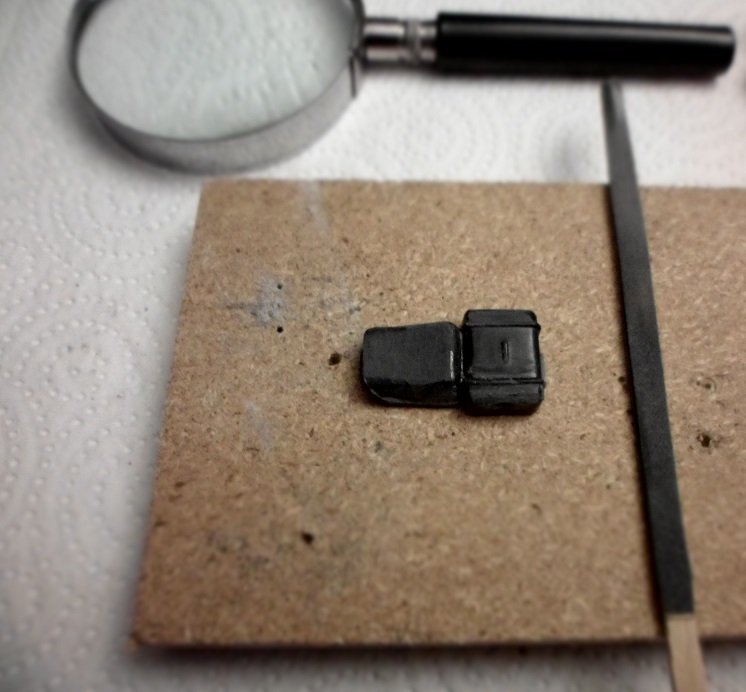 Der ausgehärtete Kleberkleck auf der Sitzbank des roten konnte nur mechanisch-zerspanend entfernt werden - eine improvisierte Feile mit Körnung 150 leistete gute Dienste. Damit später das Farbbild halbwegs gleichmäßig aussieht wurden alle relevanten Flächen ebenfalls kurz angeschliffen.