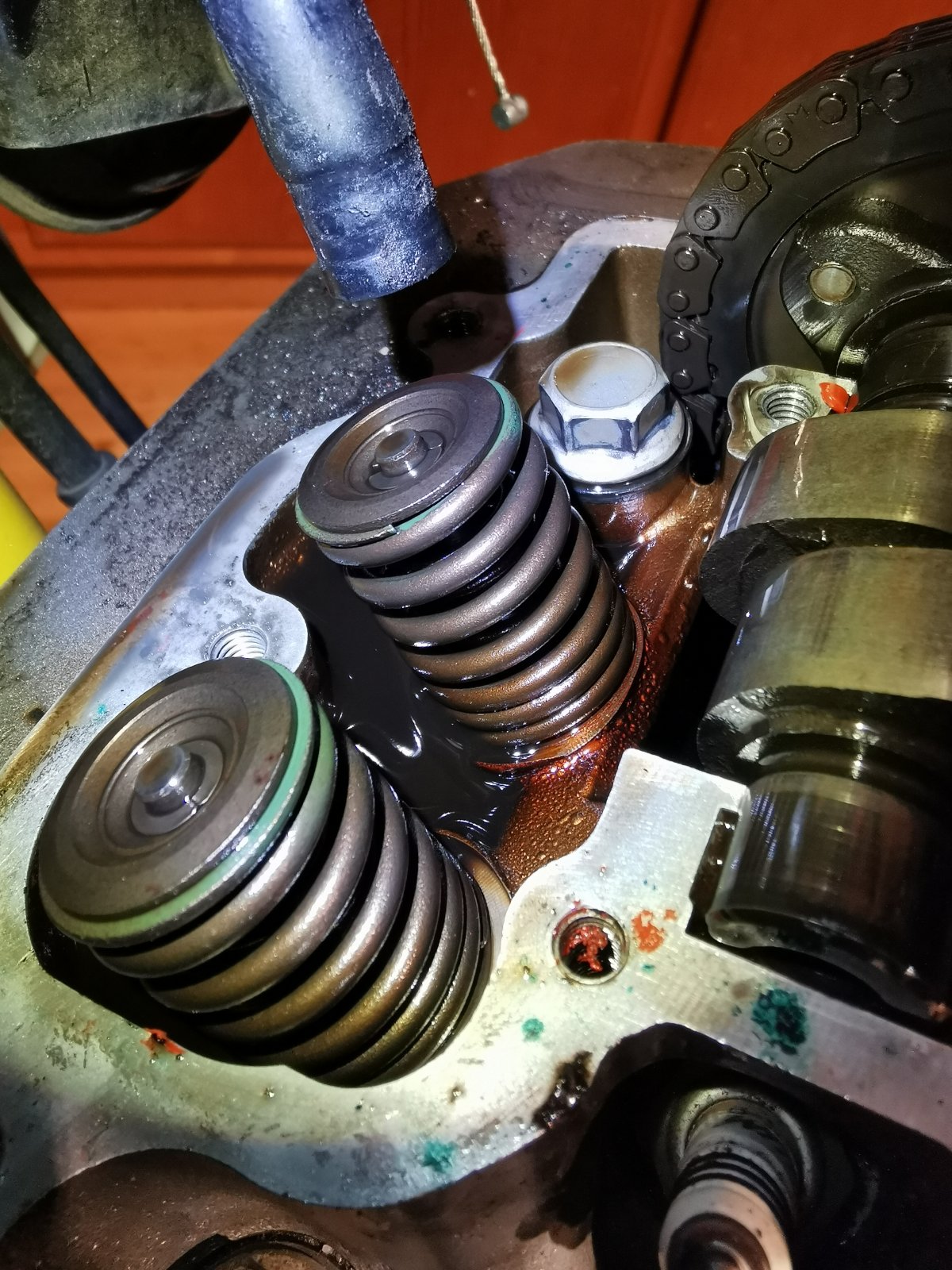 Und da ich sowas von keine Ahnung habe, frage ich mich auch ob da unter dem Zylinderkopfdeckel alles so ist wie es sein müsste. Muss da Öl sein? Ja klar es sind bewegliche Teile, aber hab noch auf keinem Foto im Forum soviel Öl dort gesehen.