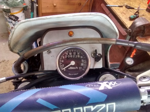 Den schon vorhandenen Tacho habe eine "Armaturenbrett" und eine kleine LED Birne gesponsert sodass nun auch eine Tachobeleuchtung sowie eine Blinkkontrolle vorhanden ist.