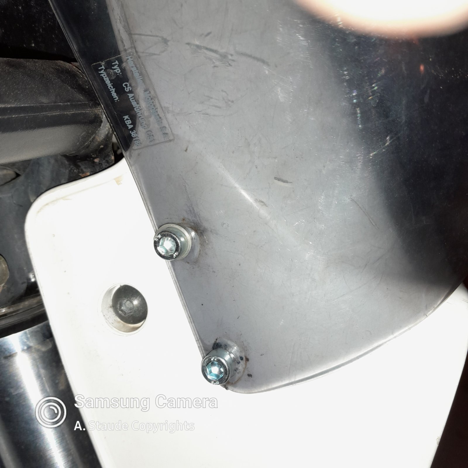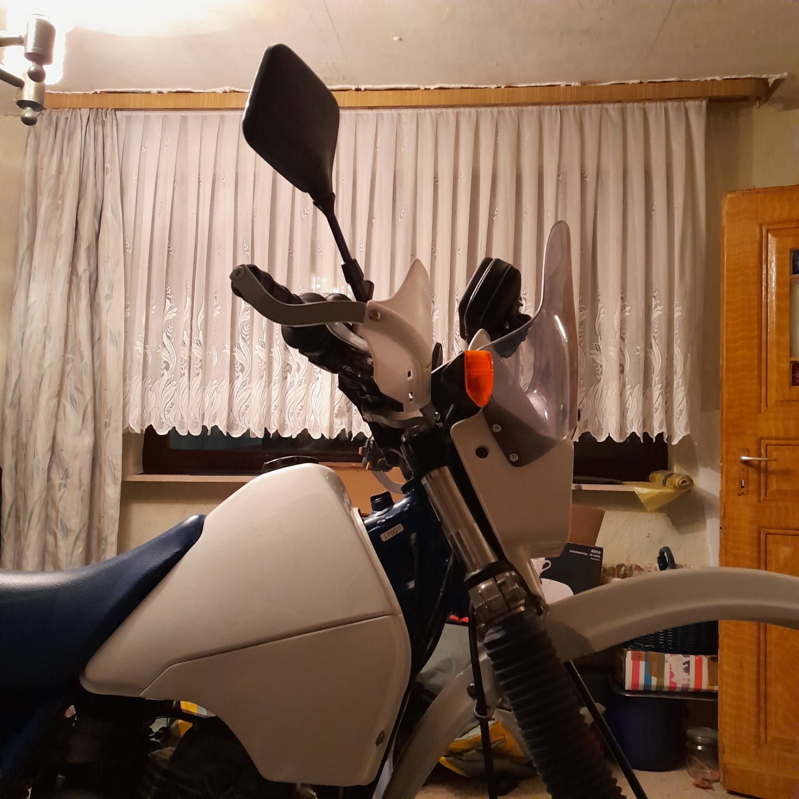 Die Frage nach dem warum ist einfach beantwortet: ich fahre die DR bei jedem Wetter. Da ist ein wenig mehr als die Lampenmaske als "Wetterschutz" sehr angenehm. Das ist wohl auch meinem Alter geschuldet - ich werde wohl etwas "weich". Seit ich die DR besitze fahre ich auch damit. In den letzten 3 Monaten war bekannter Weise außer Hitze so ziemlich alles an Wetterbedingungen auf meinen Fahrten die es in unseren Gefilden so gibt. Da war der "Wunsch" nach etwas mehr Schutz schnell geboren. In meiner Aservatenkammer war noch eine Puig-Scheibe - also wurde diese nach den ersten 500km auf der DR montiert (Befestigung an den Blinkergewinden). Für das Fahren im sitzen einwandfrei; der Wind,Regen, Graupel etc. flog sauber über den Helm - das Visier war weitgehend sauber. Nuuuuur eine Sache war ein Manko: in der stehenden Fahrweise war die Scheibe so hoch das ich bereits im leichten Gelände regelrecht Angst hatte nicht in der Scheibe mit dem Helm einzuschlagen. Also erst einmal wieder runter damit. In der Zwischenzeit wurden mehrere Fahrten von mindestens 40km morgens wie Abends (eigentlich egal - es war immer Dämmerung oder Dunkel) zu den jeweiligen Einsatzorten getätigt. Ich fing an die Scheibe zu vermissen. In Anbetracht der Tatsache das ich dieses Jahr erheblich mehr an Fahrten und zusätzlich auch noch Touren fahren will kramte ich die Scheibe wieder aus und verbrachte mehr als einen Nachmittag grübelnd an der DR. Alle Vor- und Nachteile abwägend wurde ein Entschluß gefaßt, dessen erste Eindrücke (bessere Bilder auch von der Gesamtansicht folgen zügig) Ihr jetzt schon sehen könnt.