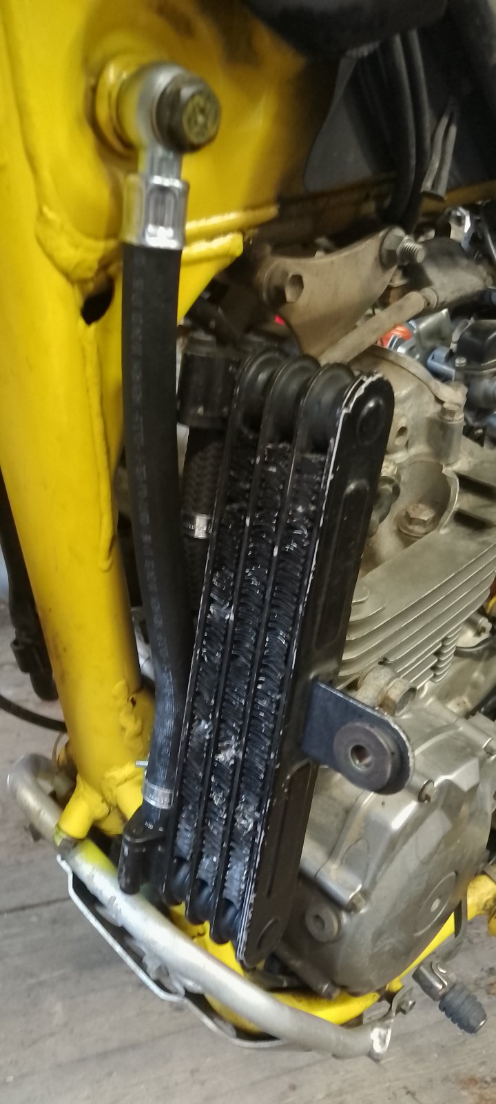Trennscheibe ja. Sicherlich wäre es besser Teilstück im abgebauten Zustand zu entfernen und dann zu spülen (vorher Oel ablassen). Ich entschied mich hier jedoch für die Variante 'Fauli". Bei den beiden anderen DRs hamm wir das auch so gemacht - mir ist klar dass das null Argument ist. Das muss jede*r für sich selbst entscheiden. An der Stelle ist es nur Gummi. Wegen der Frage mit Original-Tank weiss ich grad nicht, baue aber demnächst bei Fuhrparknummerdrei DR mit original Tank den Kühler an und kann dann berichten.