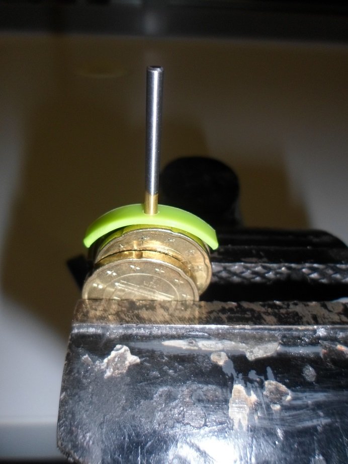Die 20 Cent Münzen entsprechen dem Durchmesser des Vorderrades. Mittels des mit eingespannten Bohrers wurde das winzige Teil gegen "wegfliegen" gesichert. Der Heißluftstrom vom Gebläse ( Heißluftföhn ) war selbst auf kleinster Stufe stark genug, das Kunststoffteil von den Münzen zu pusten.