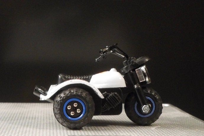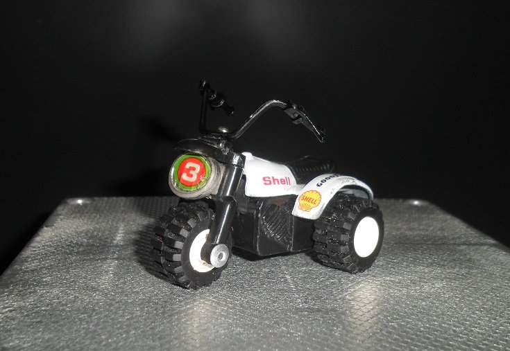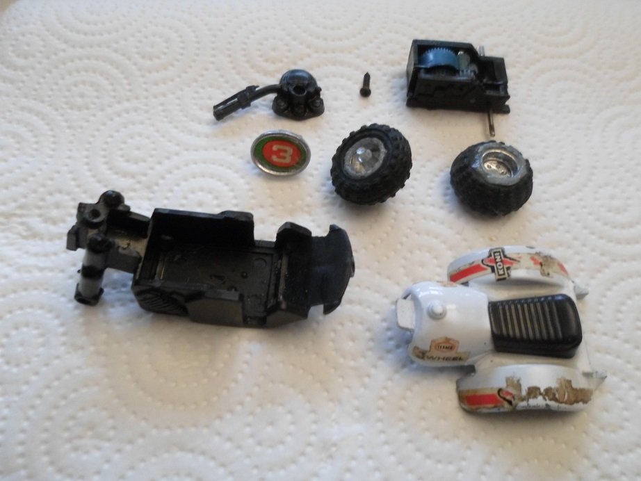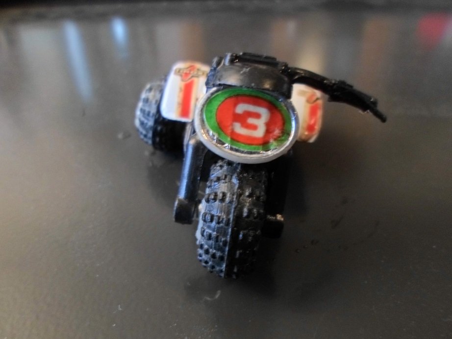 Die Felgen waren nicht mehr zu retten. Da ein Originalrad komplett fehlte, wurden kurzer Hand alle drei Räder ersetzt- Lego hat da passendes im Ersatzteil-Angebot. Lenker kam auch neu. Diese Three Wheeler gab es sowohl mit flachen als auch mit hohen Lenker. Hier wurde mein letzter hoher Lenker verbaut. Dekor kommt aus dem RC-Modellcar-Bereich.
