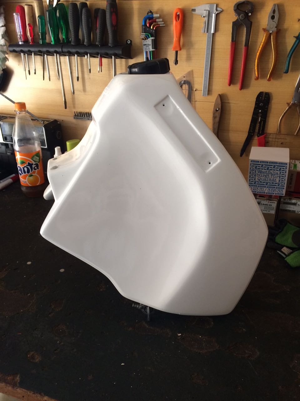 Der Tank ist frisch lackiert und sieht jetzt auch echt super aus. Gestern hätte er dann montiert werden sollen.