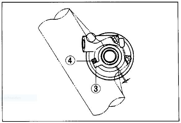 Die beiden Mitnehmernasen innen müssen in den Freiraum in der Vorderradnabe einspuren und der Zapfen (3) unter den Tauchrohranguss (4) ausgerichtet werden. Dann zuerst die Vorderradachse mit 50-80 Nm im linken Tauchrohr festziehen, rechtes Tauchrohr spannungsfrei auf der Achse ausrichten und die 4 Klemmmuttern (Deckel mit Pfeil nach oben montieren) oben beginnend mit 8 Nm festziehen.