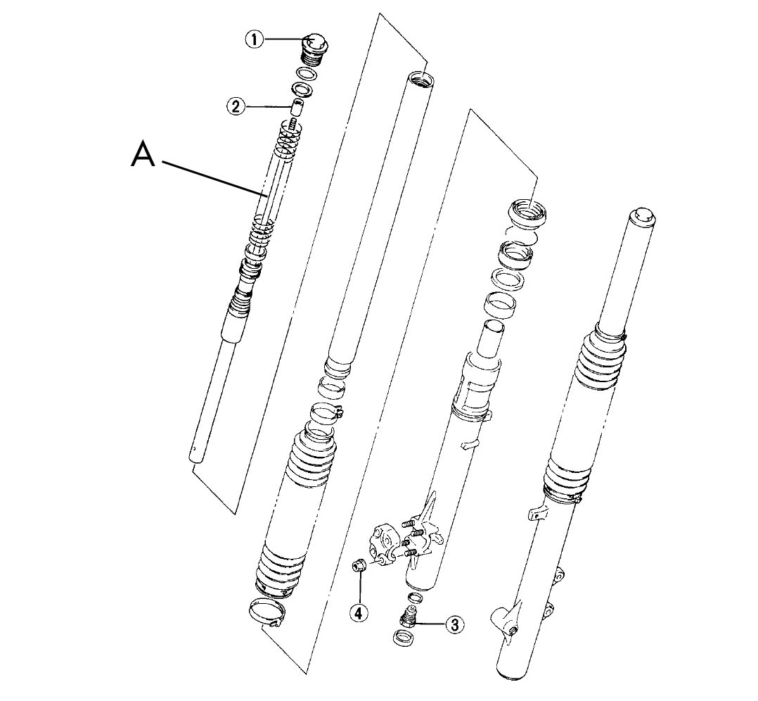 Den Trick, erst unten die Schraube an der Gabel zu lösen wollte ich gestern probieren, bewegt sich aber keinen Millimeter. Nach kurzer Internetrecherche hat sich herausgestellt, dass ich eine DR350SR besitze, dessen Gabel eine Innenstange (siehe A) hat. Deshalb mussfür die Gabeldemontage erstmal kein Spezialwerkzeug zum kontern benutzt werden.