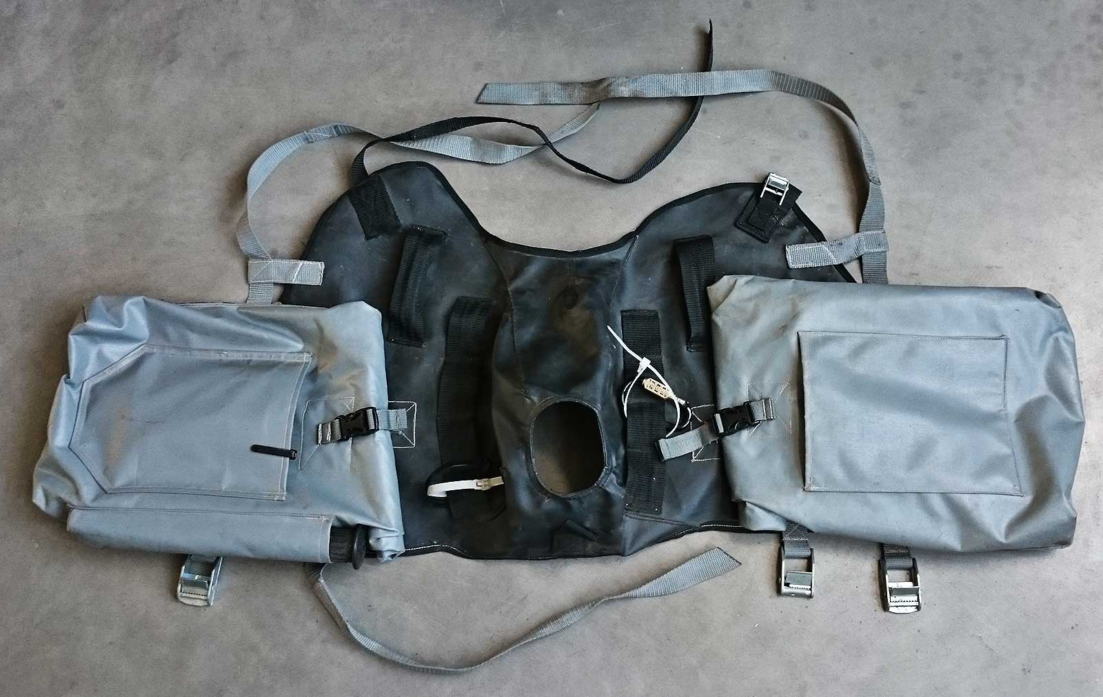 Das ganze Gebilde wird mit 4 Gurten am Tank und unter den Rahmen hindurch befestigt …