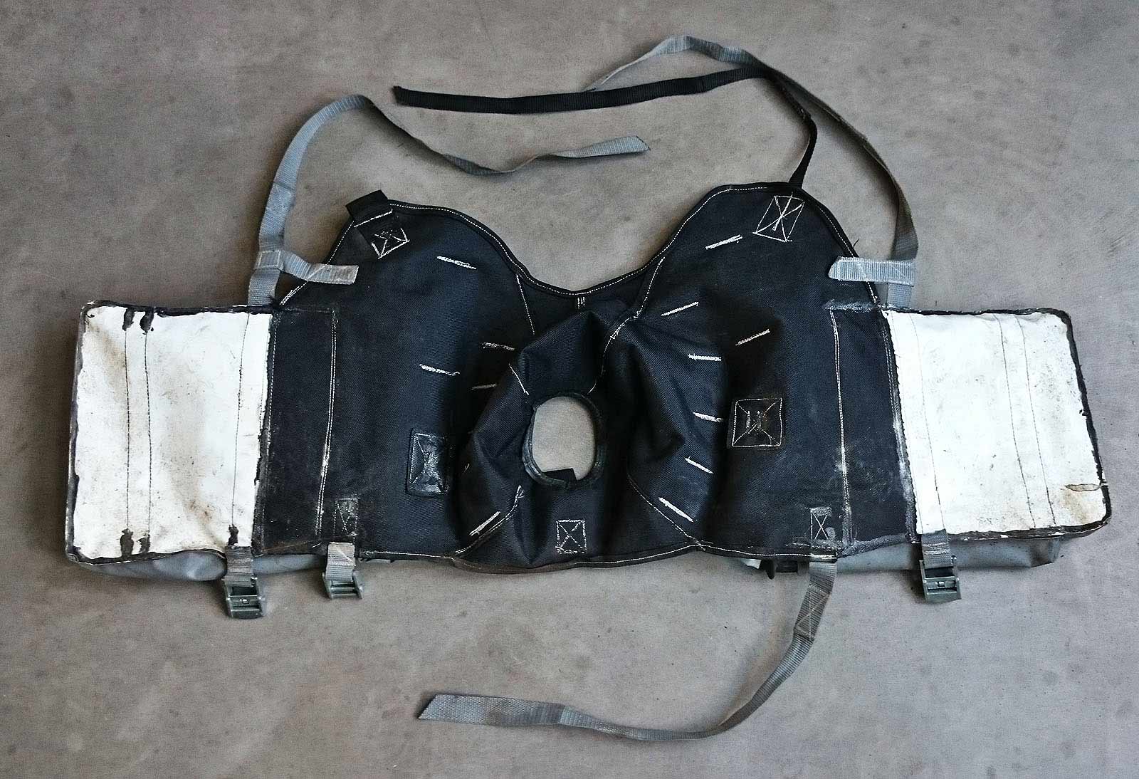 Zuerst hab ich den Tank auf den schwarzen Planenstoff gelegt, und diesen Überzug aus 4 Teilen genäht.