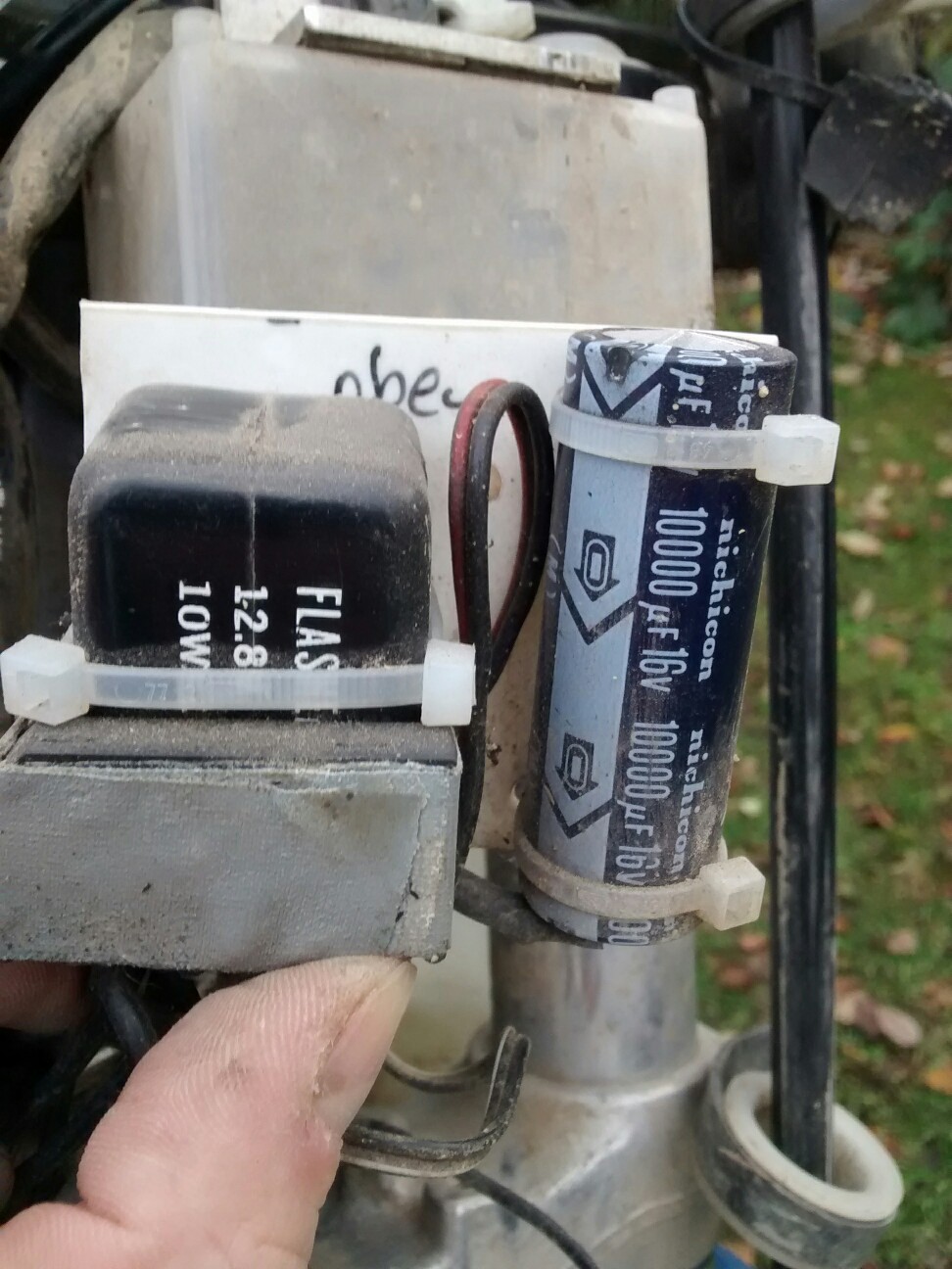 Ich habe nun die Eigenbauelektrik ziemlich genau studiert. Der Vorbesitzer hat einen großen Kondensator, einen kleinen Brückengleichrichter und ein normales 3poliges Blinkrelais verbaut.