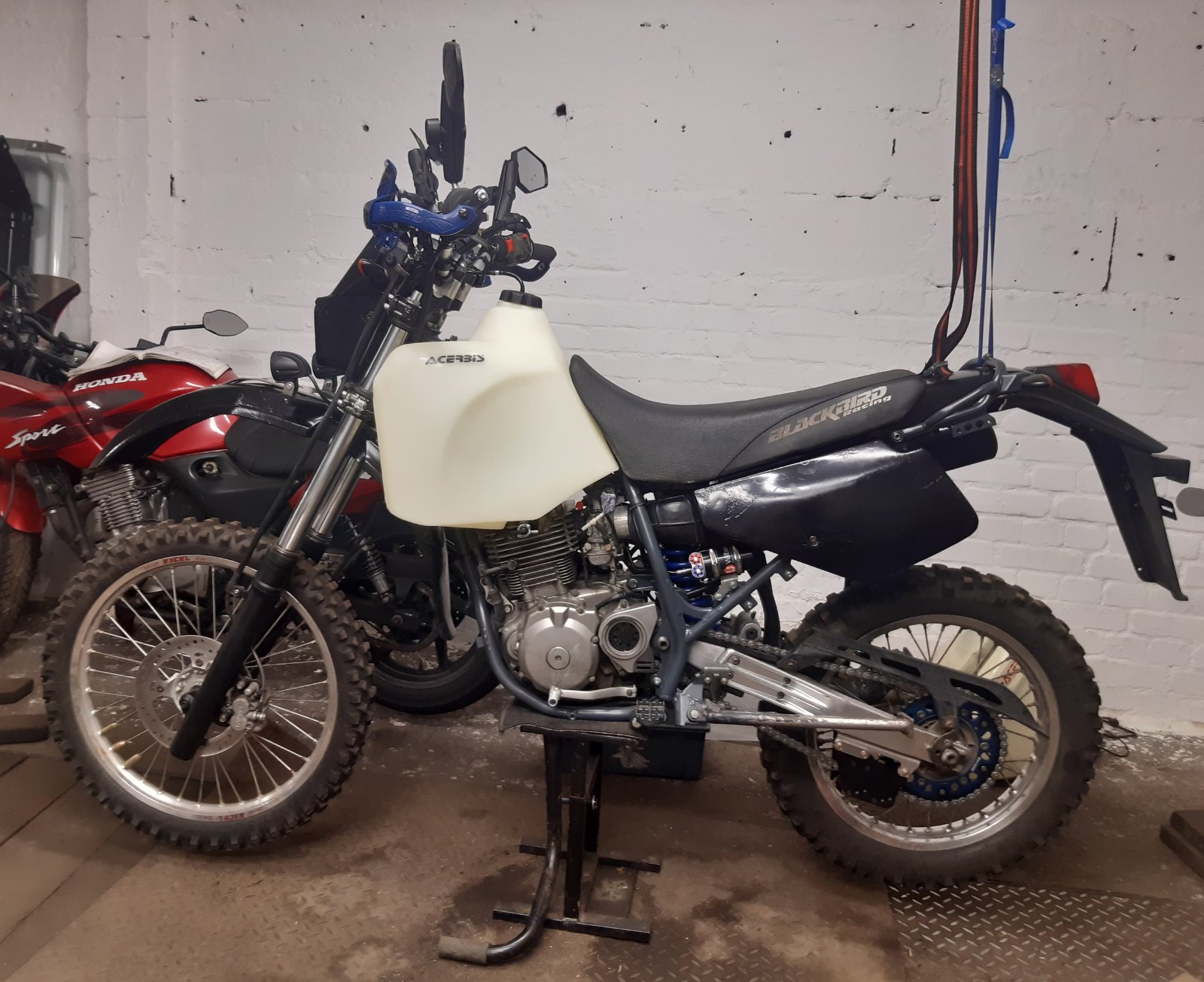 Achja, die DR350 auf den Fotos ist noch im Restaurations-Modus (wenn auch inzwischen fast fertig!). Deswegen sind noch keine Gabelschützer und kein Motorschutz montiert. ;)