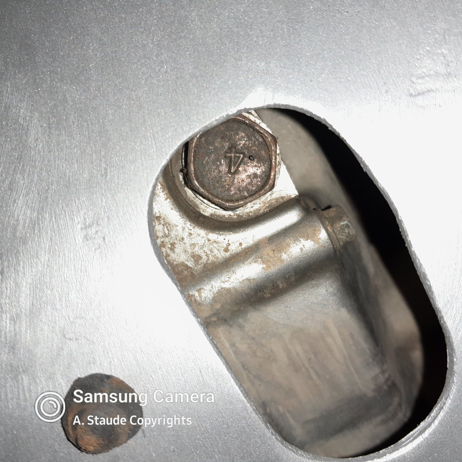Der ausgesuchte Gummipuffer paßt bestens. Bei der Montage des Schutzes wurden nun 2 M8er (8.8) und Distanzhülsen für die seitliche Befestigung neben den originalen M8er für die Front genutzt. Den 13er Schlüssel hab ich in der Werkzeugrolle bereits ergänzt.