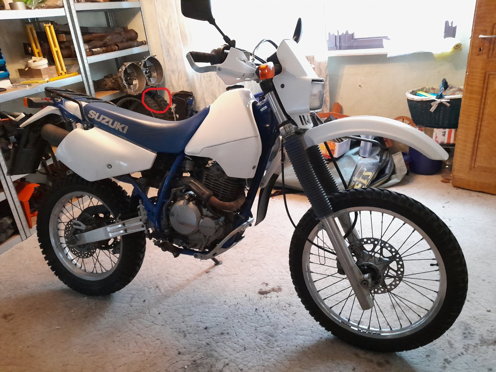 Nach einbringen der Befestigungsbohrungen kam auch der originale Spritzschutz (Kotflügelverlängerung) wieder dran. Gute Luftzufuhr ist damit gegeben (die DR lief 24tsd Km damit) und verhindert ein allzu schneller zuschlammen der Kühlrippen (was ich bei der XL/XT immer gehaßt hatte - ist ne Schweinearbeit das wieder raus zu bekommen).