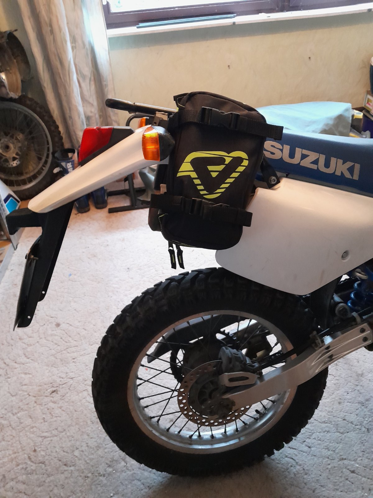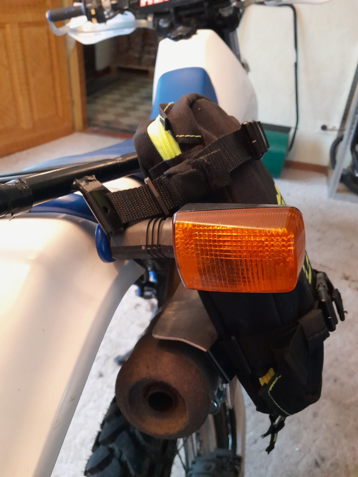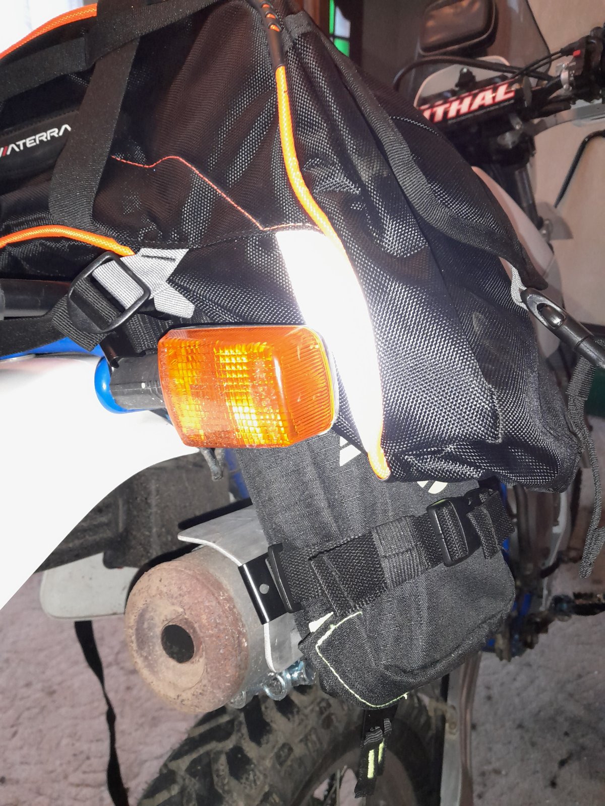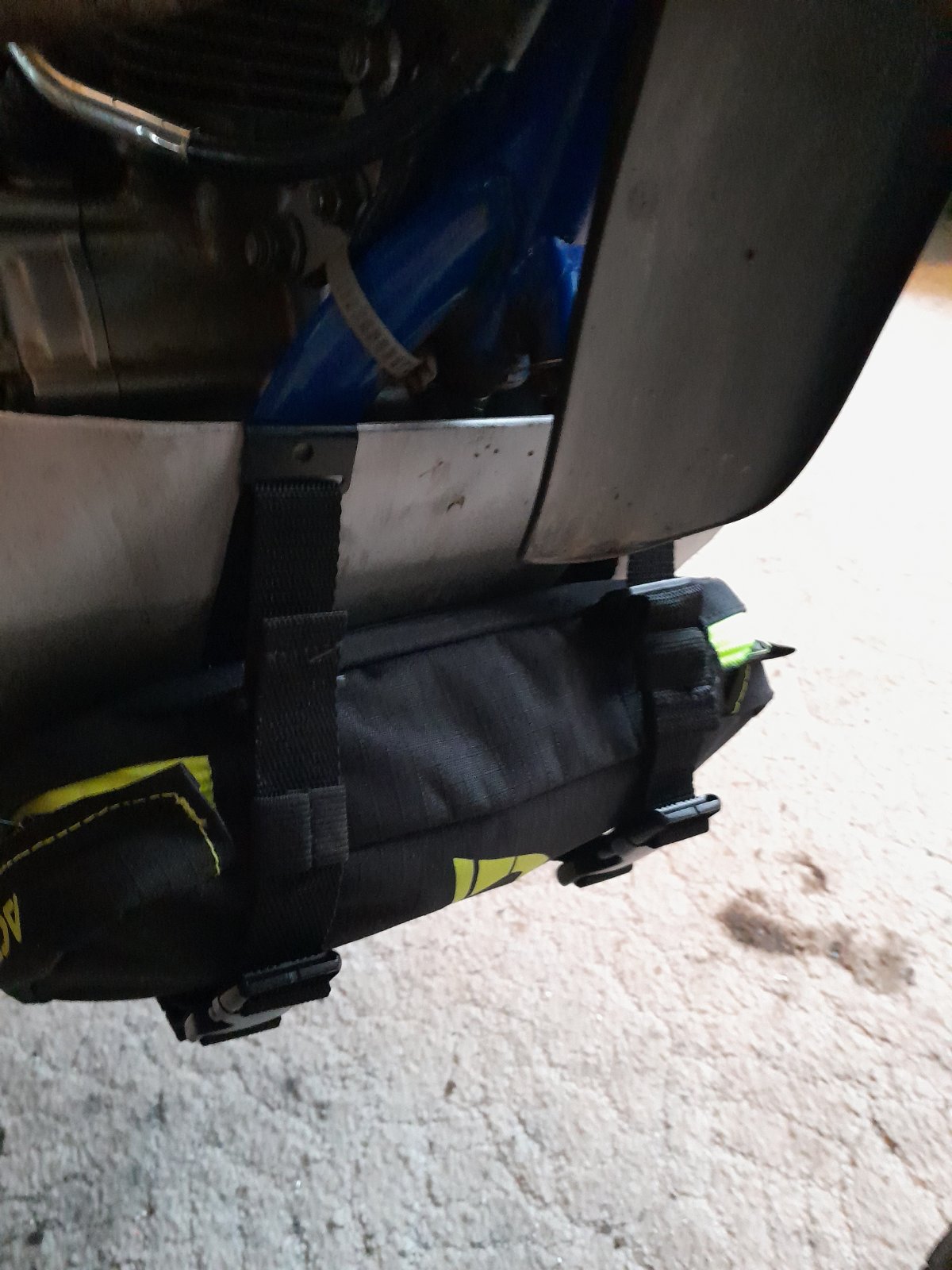Als Alternative Möglichkeit bietet es sich an die Fendertasche dort unten zu montieren. Entweder 4 kleine Schlitze in den Motorschutz einbringen damit die Halteklammern packen oder mittels Verschraubung. Dagegen spricht wieder das dort eine Menge Dreck etc. während der Tour dagegen geschaufelt wird (vom Vorderrad). Also suboptimal.