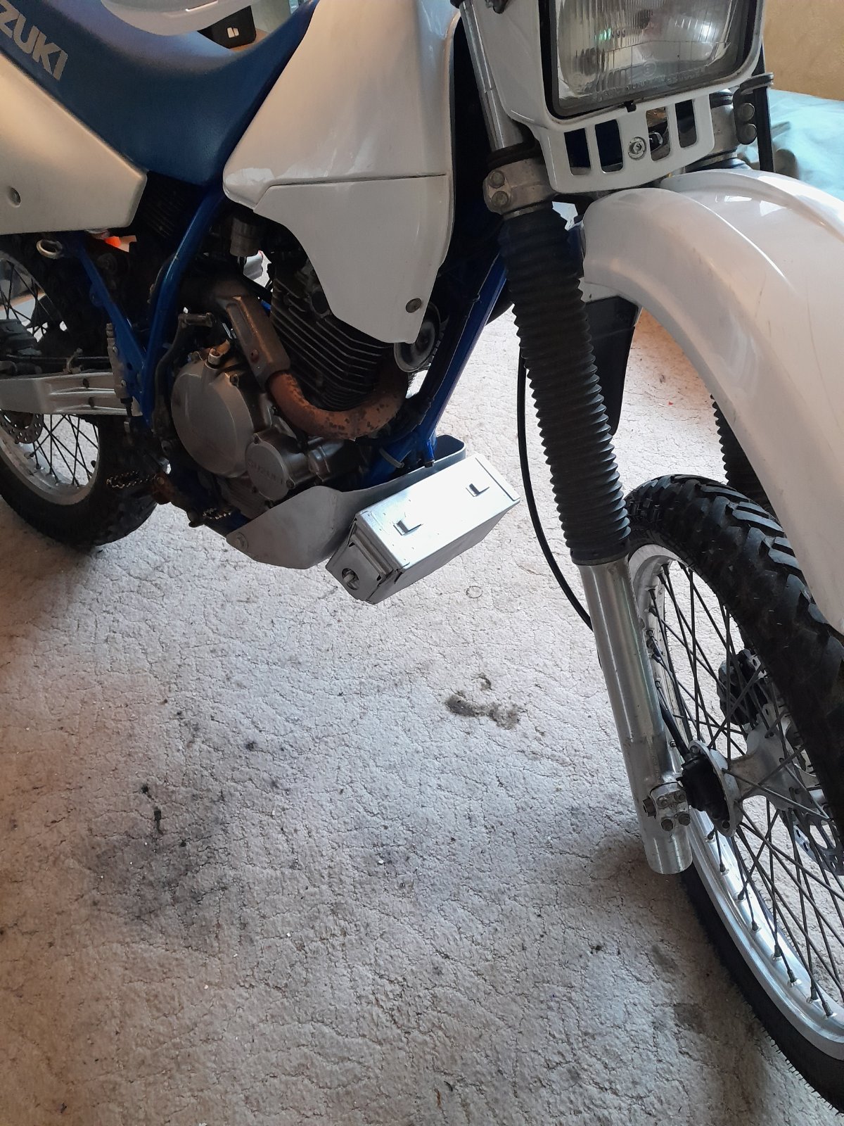 Der Spritzschutzlappen wurde auch gekürzt damit sich nichts Verhaken kann. Die Schutzwirkung vor Steinen etc. der Ölablaßschraube / Rahmen sind immer noch gegeben.