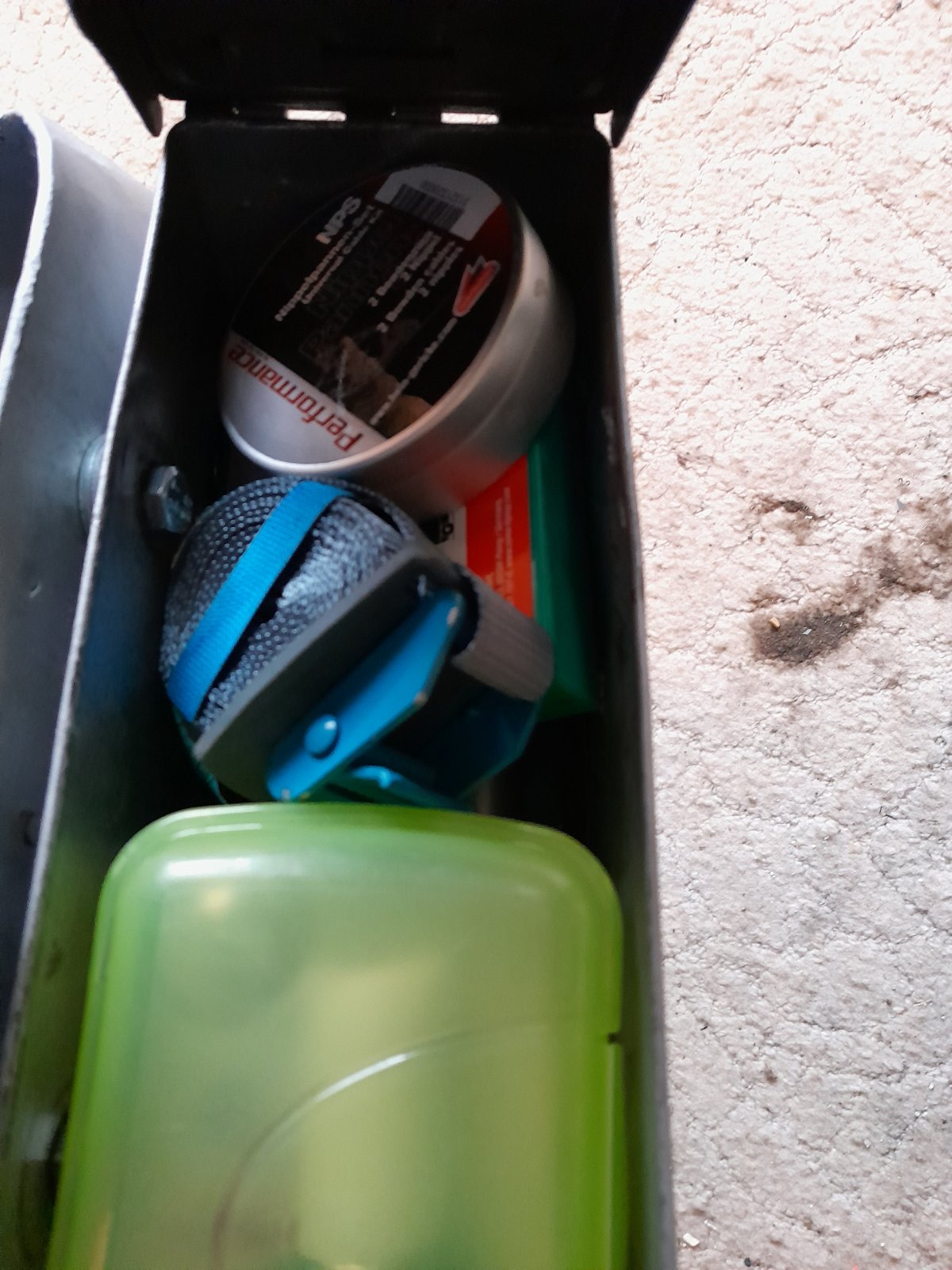 Erstaunlich, was da alles rein gehtOben drauf kam dann noch ein Lappen und schon ist alles Rüttel- und klapperfest gepackt.