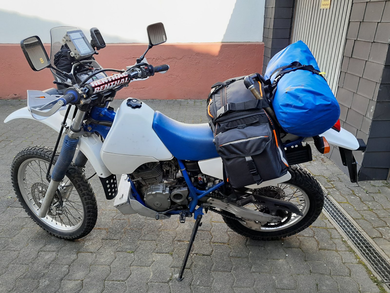 Voll gepackt (wie im Mai benötigt) kam ich auf 18kg inklusive 3 Liter Ersatzkanister Benzin, 2,5Liter Wasser (1Liter hinten, 1,5 Liter im Trinkrucksack) sowie der gesamten Camping- und Fahrzeugausrüstung. Ich änderte noch vor Fahrt die Position der Gepäcktaschen; das ganze um ca. 15cm weiter nach hinten. Während der Fahrt stört mich lediglich das der Trinkrucksack permanent auf dem Gepäck "aufsaß". Da muß nachgebessert werden. Zur Gepäcktasche an sich ist noch einmal etwas zu bessrn; ich werde die Ausrüstung noch etwas mehr abspecken um einfach nach dem "Zelten" etwas schneller wieder alles verpackt zu bekommen ohne alles auf exaktem Maßen wieder einräumen zu müssen.