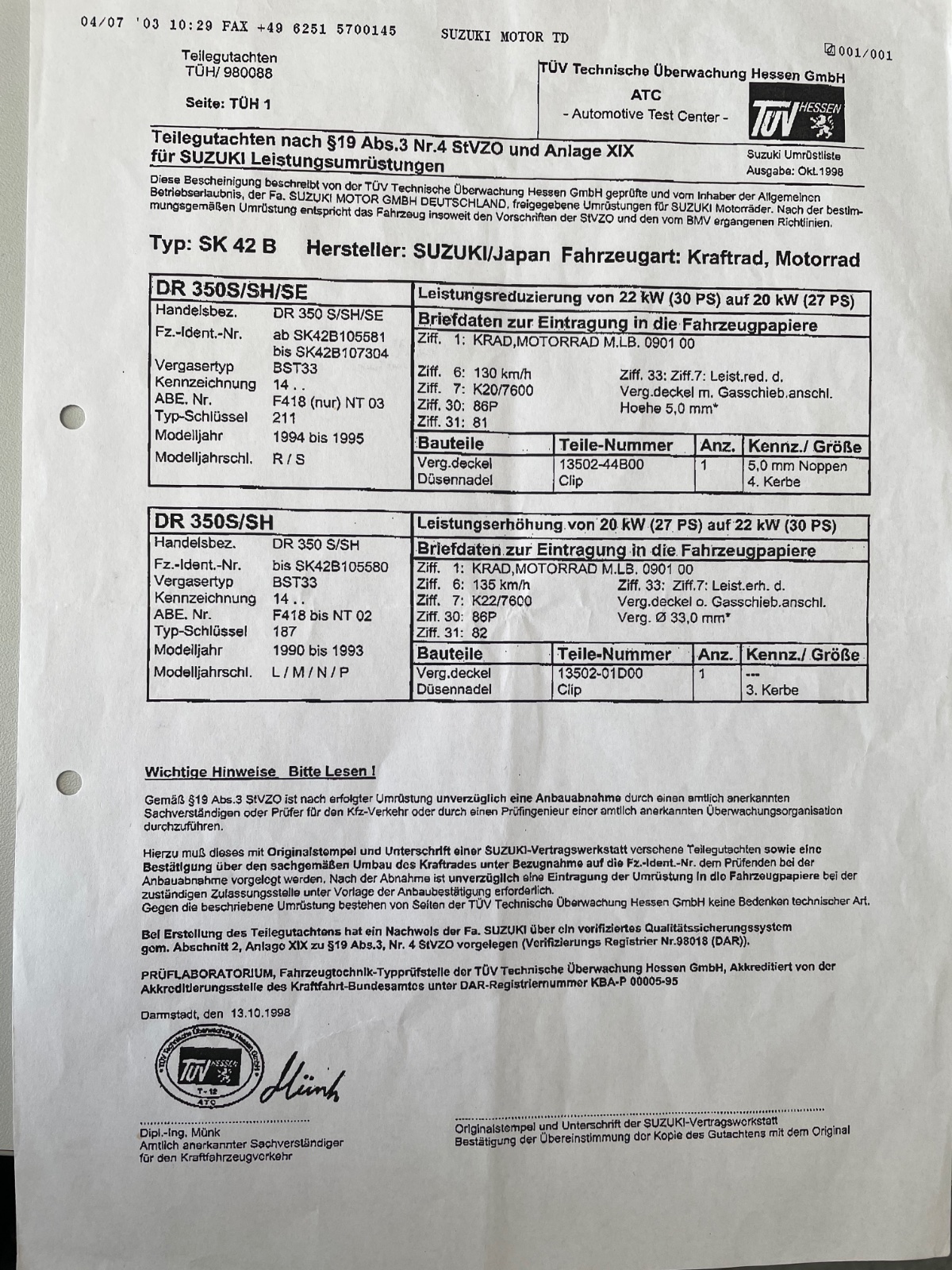 Es wurde eine Suzuki DR 350 SHC SK42A, Erstzulassung in 1995.