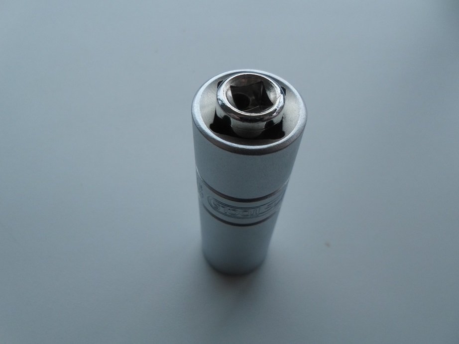 Diese passte sehr exakt ( leichter Druck war erforderlich ) oben in den 1/2 Zoll Anschluß der Kerzennuß.
