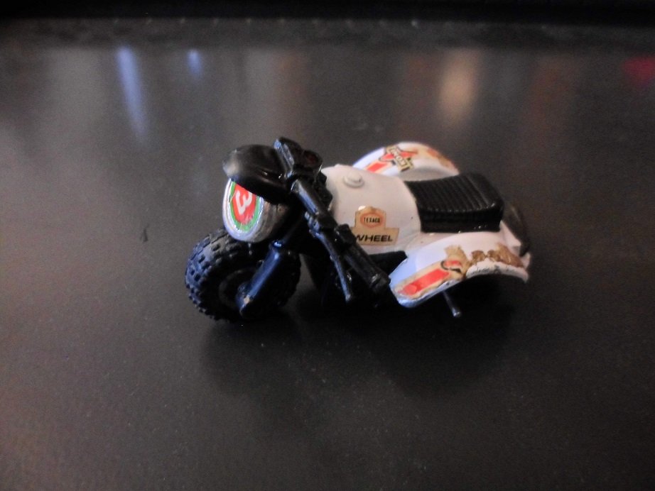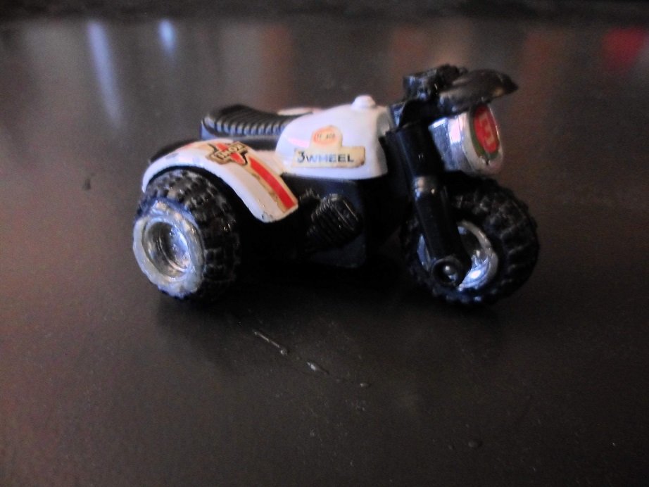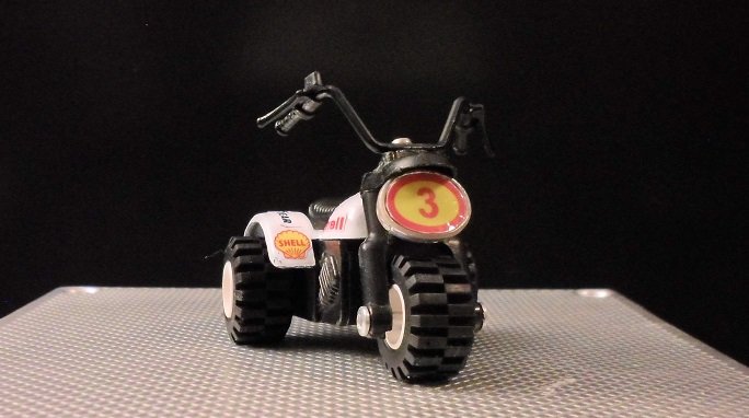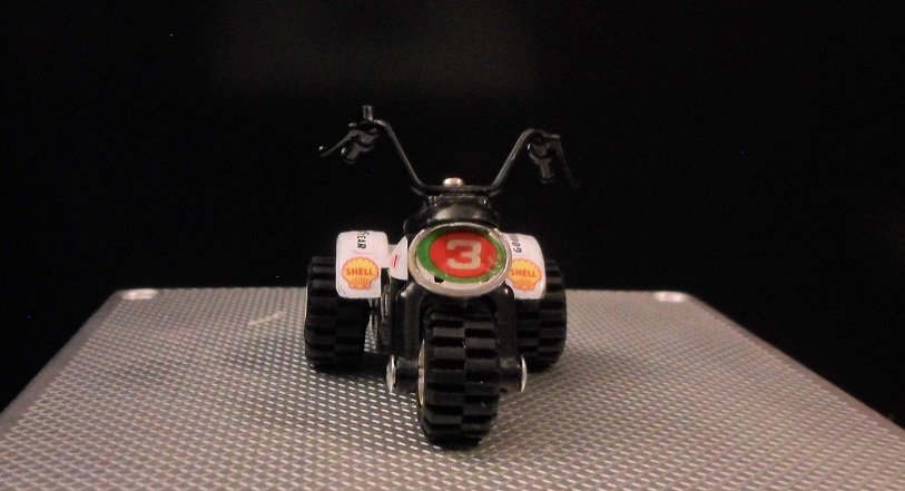 Die Felgen waren nicht mehr zu retten. Da ein Originalrad komplett fehlte, wurden kurzer Hand alle drei Räder ersetzt- Lego hat da passendes im Ersatzteil-Angebot. Lenker kam auch neu. Diese Three Wheeler gab es sowohl mit flachen als auch mit hohen Lenker. Hier wurde mein letzter hoher Lenker verbaut. Dekor kommt aus dem RC-Modellcar-Bereich.