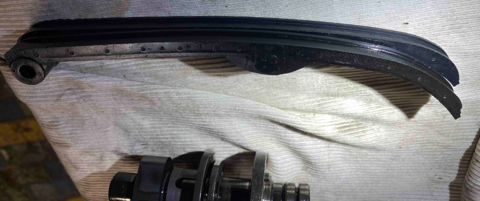 Kurz - ich habe dann die neue Kette eingebaut und sie ist jetzt bei 14 Klicks straff. Bleiben also noch 11 Klicks über (die Zahnstange hat insgesamt 25). Also doch ein Unterschied! Das heißt aber, die Spannschienen müssen eigentlich auch neu. Die Biegung der hinteren Schiene ist deutlich, aber nicht so schlimm, wie auf dem Foto von „derMarkus“ auf Seite 7. In der Lauffläche waren geringe Einlaufspuren, aber auch schon Mikrorisse zu erkennen!
